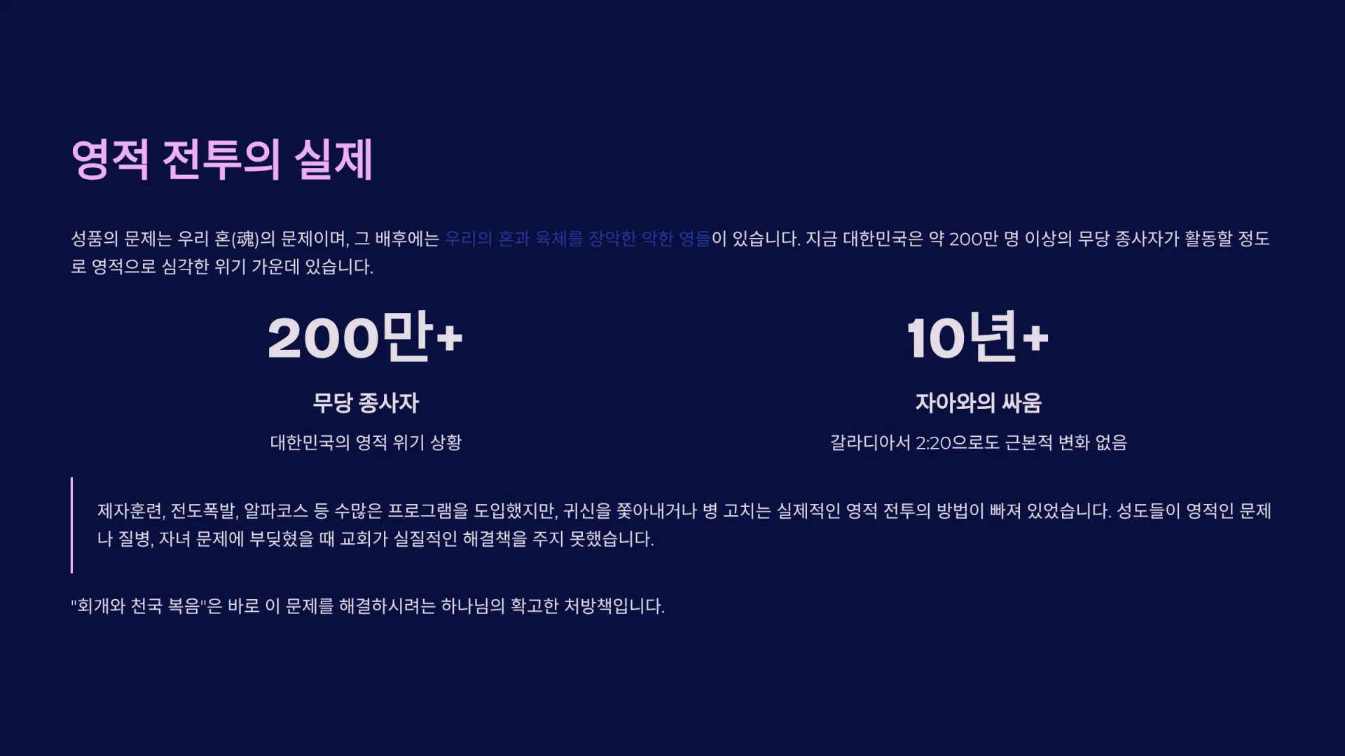 그런데 성품의 문제는 대한민국 교회가 반드시 극복해야 할 중요한 과제중 하나이다. 과거 우리는 전도폭발, 제자훈련, 알파코스, G12, D12 등 수많은 프로그램을 도입하며 애썼다. 그러나 제자훈련에는 귀신을 쫓아내거나 병 고치는 실제적인 영적 전투의 방법이 빠져 있다. 그러다 보니 성도들이 나이가 들어 영적인 문제(신기)나 질병, 자녀 문제에 부딪혔을 때 교회가 실질적인 해결책을 주지 못했다.