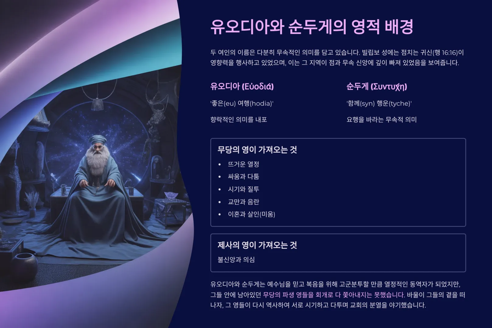 거로 유오디아와 순두게는 이방인으로서 이러한 무속 신앙의 배경을 가졌을 가능성이 높다. 그들은 예수님을 믿고 복음을 위해 ‘고군분투’할(빌 4:3) 만큼 열정적인 동역자가 되었지만, 그들 안에 남아있던 무당의 파생 영들을 회개로 다 쫓아내지는 못했던 것이다. 결국 바울이 그들의 곁을 떠나자, 그 영들이 다시 역사하여 서로 시기하고 다투며 교회의 분열을 야기한 것이다. 그러므로 이들의 다툼은 단순한 성격 차이만 가리키는 것이 아니었다. 그것은 생명책에서 이름이 지워질 수도 있는 심각한 영적 문제였다(빌 4:3, 계 3:5 참조). 바울은 이 사실을 알았기에 그토록 안타까워하며 "내가 간청하고 간청한다. 제발 주 안에서 같은 마음을 품으라"(빌 4:2)고 호소했던 것이다.