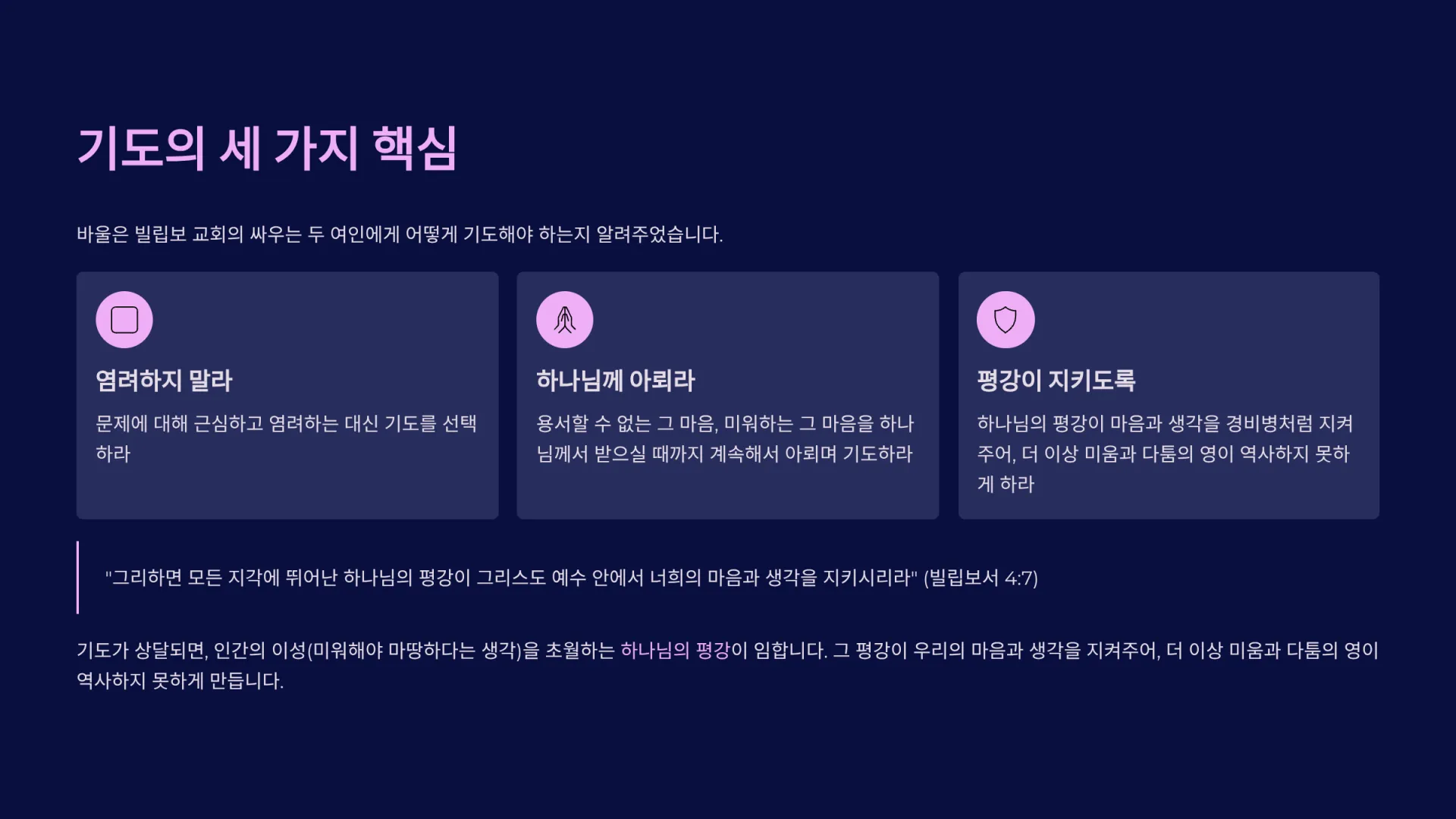 결국 바울의 처방은 회개와 용서, 그리고 간절한 기도이다. 미워하고 시기했던 죄를 회개하고, 상대를 너그럽게 용서하며, 내 힘으로 안 되니 하나님의 평강이 임하여 내 마음을 지켜주실 때까지 간절히 기도하라는 것이다.