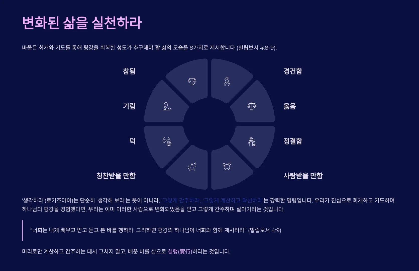 즉, 우리가 진심으로 회개하고 기도하며 하나님의 평강을 경험했다면, 우리는 이미 다음과 같은 사람으로 변화되었음을 믿고 그렇게 간주하며 살아가라는 것이다. 그렇게 살다보면, 우리가 참되며 (진실하며), 경건하며 (존경받을 만하며), 옳으며 (의로우며), 정결하며 (깨끗하며), 사랑받을 만하며 (남들이 좋아할 만하며), 칭찬받을 만하며 (호평받으며), 덕이 있는 사람이 되며, 기림(칭찬)이 있는 사람이 될 것이라고 했다. 설령 지금 그렇게 자신이 보이지 않는다고 할지라도 장차 우리도 그러한 존재가 되는 것을 기뻐하고 계산하고 나아가라는 것이다. 그리고 9절은 이 모든 것을 완성하는 마지막 열쇠를 제시한다. “너희는 내게 배우고 받고 듣고 본 바를 행하라(실행하라). 그리하면 평강의 하나님이 너희와 함께 계시리라.” 그렇다. 머리로만 계산하고 간주하는 데서 그치는 것이 아니라, 배운 바를 삶으로 실행(實行)하라는 것이다. 유오디아와 순두게는 머리로는 용서해야 함을 알았을지라도, 실제로 찾아가서 "자매님, 내가 잘못했습니다. 용서해 주십시오."라고 실행하지 않았던 것이다.