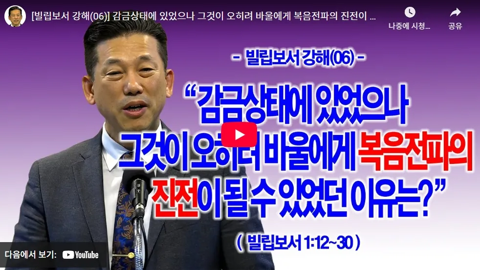 제목: [빌립보서 강해(06)] 감금상태에 있었으나 그것이 오히려 바울에게 복음전파의 진전이 될 수 있었던 이유는?(빌1:12~30)_2025-10-23(목)