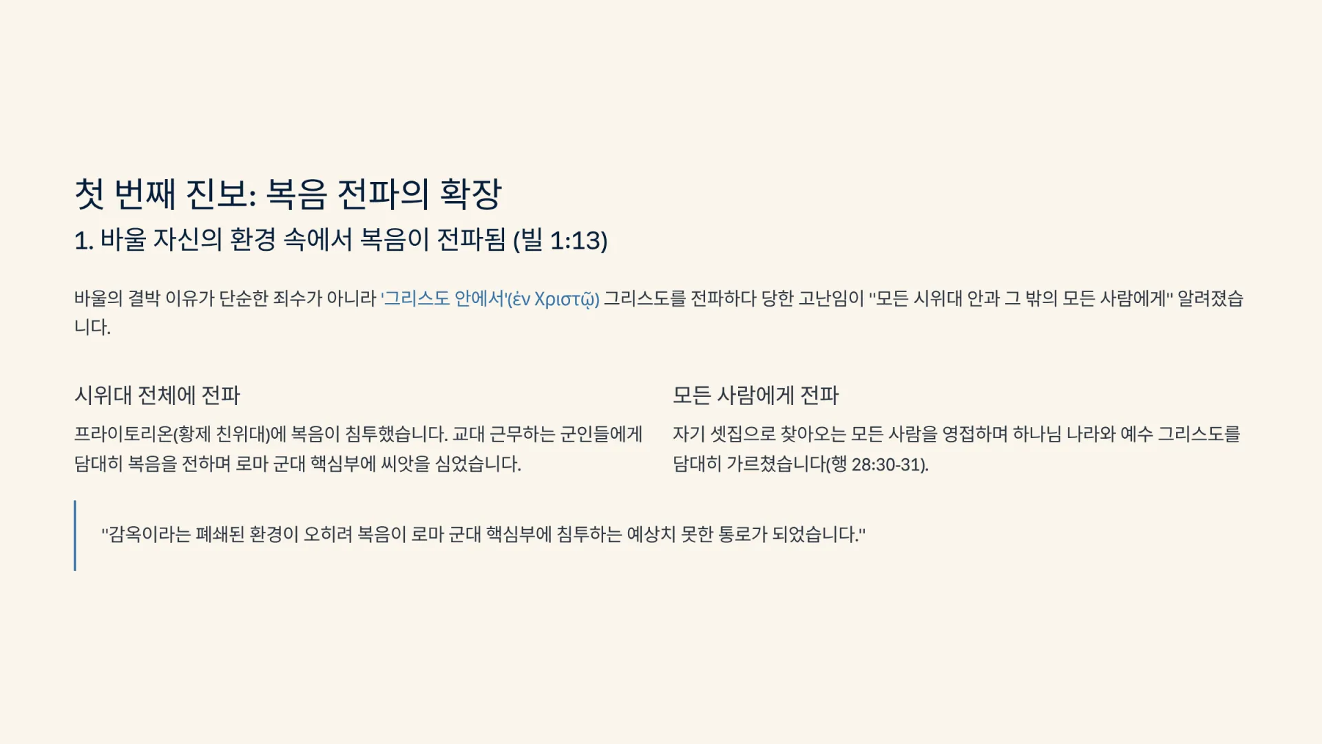 첫째, 바울 자신이 처한 환경 속에서 복음이 전파되었다(빌 1:13)는 것이다. 바울의 매임, 즉 그가 결박된 이유가 단순히 정치범이나 일반 죄수가 아니라 ‘그리스도 안에서’(ἐν Χριστῷ), 즉 그리스도를 전파하다가 당한 고난이라는 사실이 “모든 시위대 안과 그 밖의 모든 사람에게 나타났다”고 말한다. ‘시위대 안’(ἐν ὅλῳ τῷ πραιτωρίῳ, 엔 홀로 토 프라이토리오) 곧 ‘프라이토리온’은 로마 총독 관저나 황제의 친위대 병영을 의미한다. 사도행전 28장 16절과 30-31절에 따르면, 바울은 로마에서 2년 동안 자기 셋집에 머물면서 자기를 지키는 로마 군인과 함께 지냈다. 그는 이 기간 동안 자신을 감시하는 군인들에게 담대하게 복음을 전했고, 군인들이 교대로 바뀌면서 복음은 자연스럽게 시위대 전체에 퍼져나갔다. 감옥이라는 폐쇄된 환경이 오히려 복음이 로마 군대 핵심부에 침투하는 예상치 못한 통로가 된 것이다.  그리고 ‘그 밖의 모든 사람에게’도 전파되었다고 한다. 이는 바울이 비록 결박된 상태였지만, 자기 셋집으로 찾아오는 모든 사람을 영접하며 하나님의 나라와 주 예수 그리스도에 관한 모든 것을 담대하게 가르쳤음을 알 수 있다(행 28:30-31). 그의 가르침은 유대인 지도자들뿐 아니라 로마 사회의 다양한 계층 사람들에게까지 전파되었을 것이다. 이처럼 바울은 자신에게 주어진 최악의 환경을 최선의 복음 전파 기회로 삼았다. 그는 자신의 처지를 비관하거나 원망하지 않고, 만나는 모든 사람에게 그리스도를 증거함으로써 로마 심장부에 복음의 씨앗을 심었던 것이다.