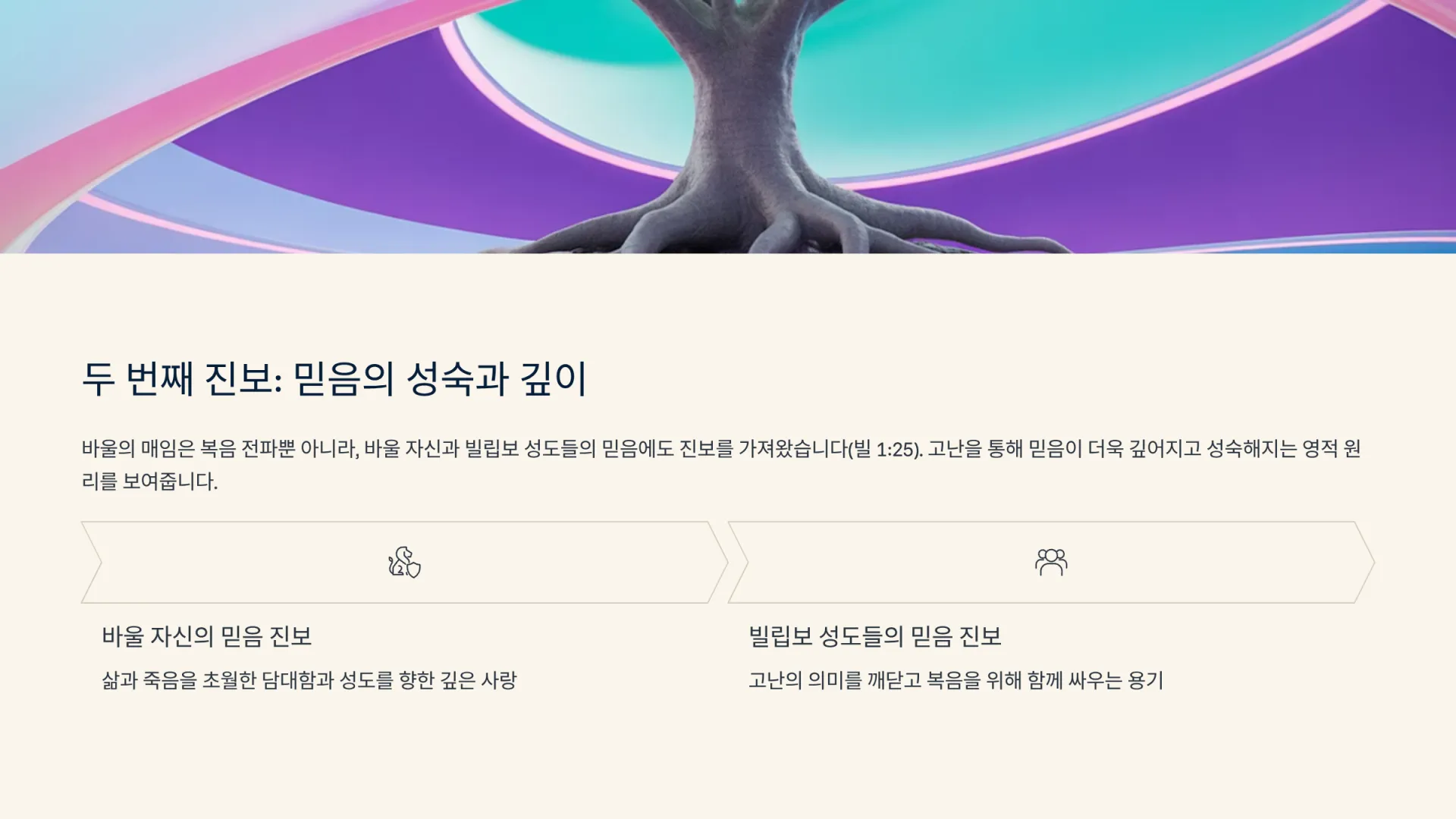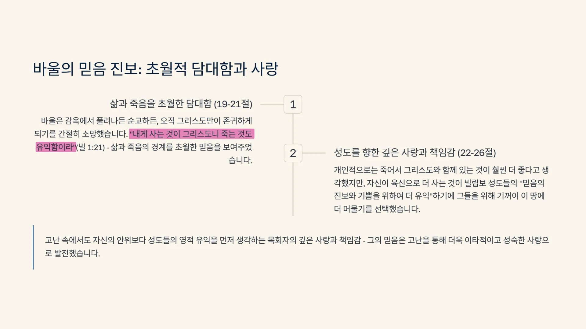 결국, 바울의 매임이라는 고난은 바울 자신에게는 죽음을 초월하는 담대한 믿음과 성도를 향한 깊은 사랑을 확인시켜 주었고, 빌립보 성도들에게는 고난의 영적 의미를 깨닫고 복음을 위해 함께 싸우도록 격려함으로써 믿음의 진보를 가져오는 중요한 역할을 했다. 이는 고난이 결코 무의미한 것이 아니라, 오히려 우리의 믿음을 정금같이 연단하고 하나님 나라를 위해 더 큰 일을 감당하게 하는 통로가 될 수 있음을 보여준다.