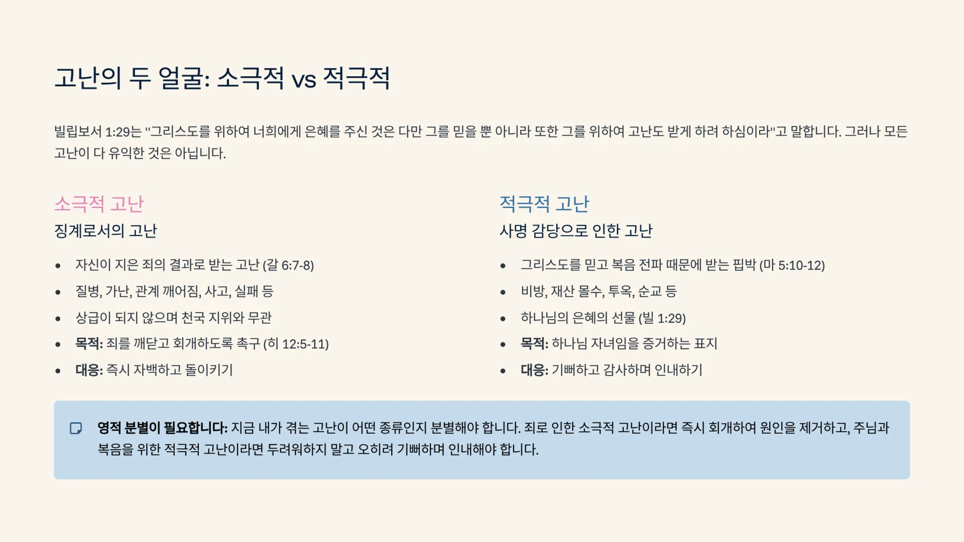 바울은 빌립보서 1장 29절에서 “그리스도를 위하여 너희에게 은혜를 주신 것은 다만 그를 믿을 뿐 아니라 또한 그를 위하여 고난도 받게 하려 하심이라”고 말한다. 이는 그리스도인이 받는 고난이 하나님의 은혜의 선물일 수 있음을 시사한다. 그러나 모든 고난이 다 유익하거나 상급이 되는 것은 아니다. 성경적으로 볼 때, 그리스도인이 받는 고난은 크게 두 종류로 나눌 수 있다.