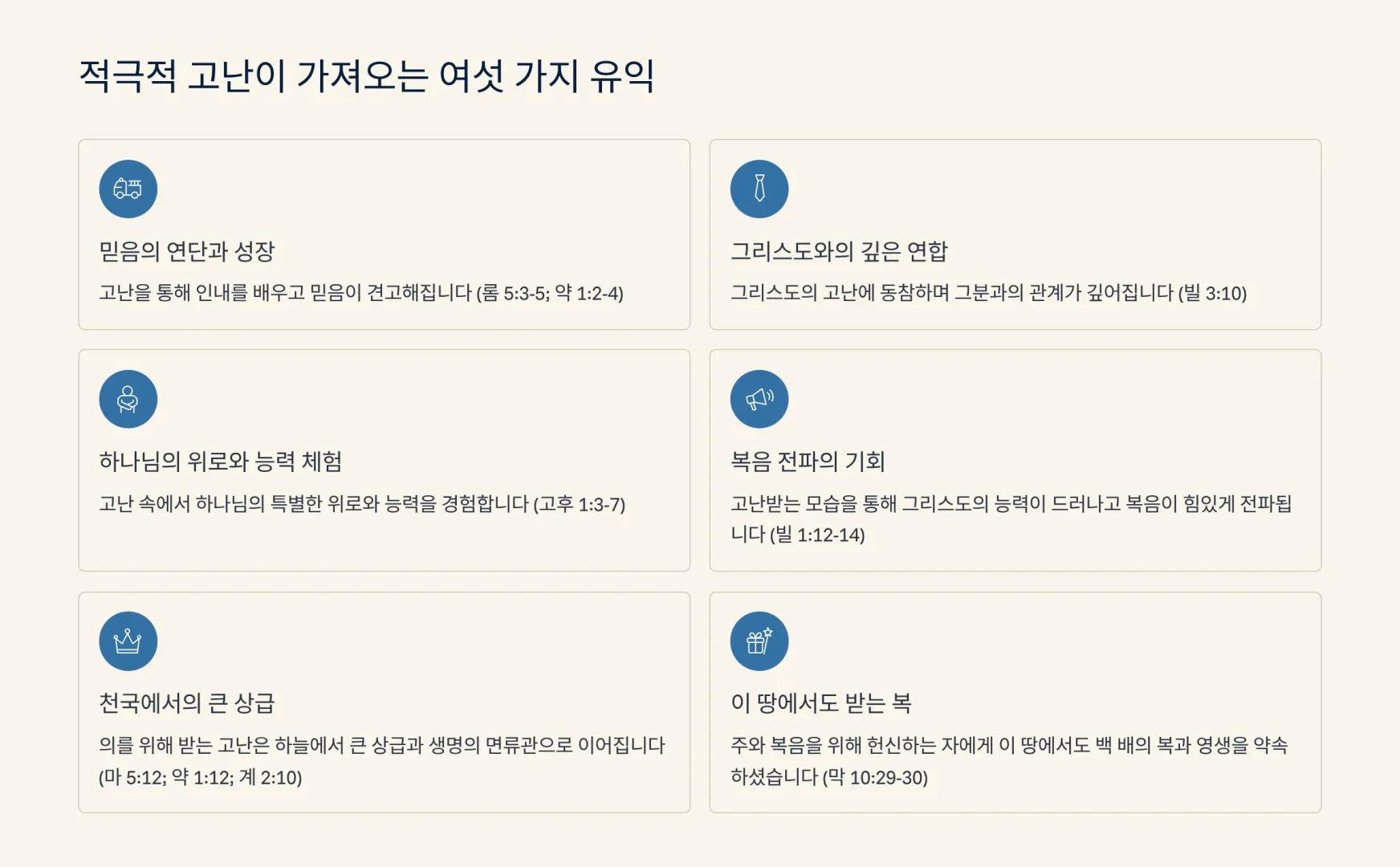 그리고 이러한 적극적인 고난은 다음과 같은 영적 유익을 가져다준다. 첫째로, 믿음의 연단과 성장을 가져온다. 고난을 통해 인내를 배우고 믿음이 더욱 견고해지기 때문이다(롬 5:3-5; 약 1:2-4). 둘째로, 그리스도와의 깊은 연합을 가져온다. 그리스도의 고난에 동참함으로써 그분과의 관계가 더욱 깊어지는 것이다다(빌 3:10). 셋째로, 하나님의 위로와 능력을 체험케 해 준다. 고난 속에서 하나님의 특별한 위로와 능력을 경험하게 되기 때문이다(고후 1:3-7).넷째로, 복음을 전파할 기회를 갖게 되는 것이다. 고난받는 모습을 통해 그리스도의 능력이 드러나고 복음이 더욱 힘있게 전파된다(빌 1:12-14). 다섯째로, 죽어서는 천국에서의 큰 상급: 의를 위하여, 그리스도를 위하여 받는 고난은 하늘에서 큰 상급과 면류관(생명의 면류관 등)으로 이어진다(마 5:12; 약 1:12; 계 2:10). 그리고 여섯째로, 이 땅에서도 복을 받게 한다는 것이다. 주와 복음을 위해 모든 것을 버리고 헌신하며 고난받는 자에게는 이 땅에서도 백 배의 복(물질적, 관계적, 영적 축복)과 영생을 약속하셨다(막 10:29-30). 물론 박해를 겸하여 받지만, 하나님의 풍성한 공급하심과 돌보심을 경험하게 된다.