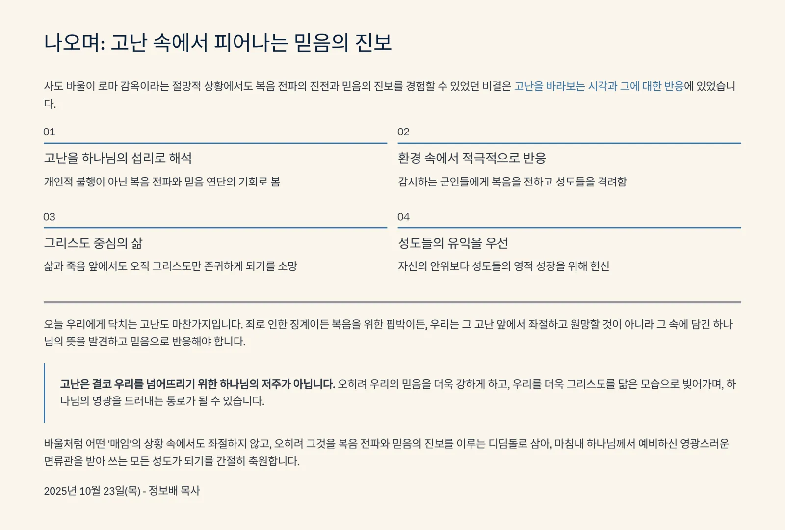 아침묵상입니다. 제목: [빌립보서 강해(06)] 감금상태에 있었으나 그것이 오히려 바울에게 복음전파의 진전이 될 수 있었던 이유는?(빌1:12~30)_2025-10-23(목) https://youtu.be/nr3fwNokZFY 1. 들어가며 빌립보서는 사도 바울이 로마 감옥에 갇힌 상태, 즉 ...