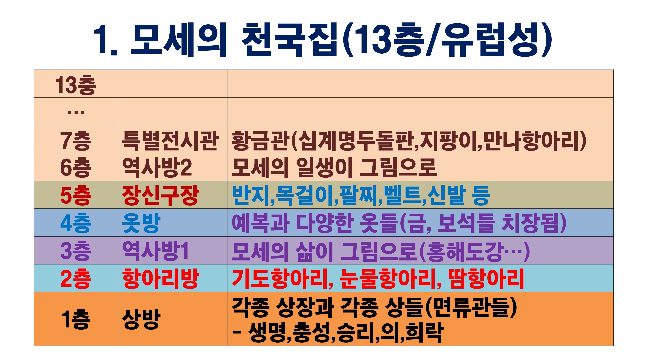 첫째, 구약시대 인물인 모세의 천국집은 13층인데, 유럽성처럼 보인다.