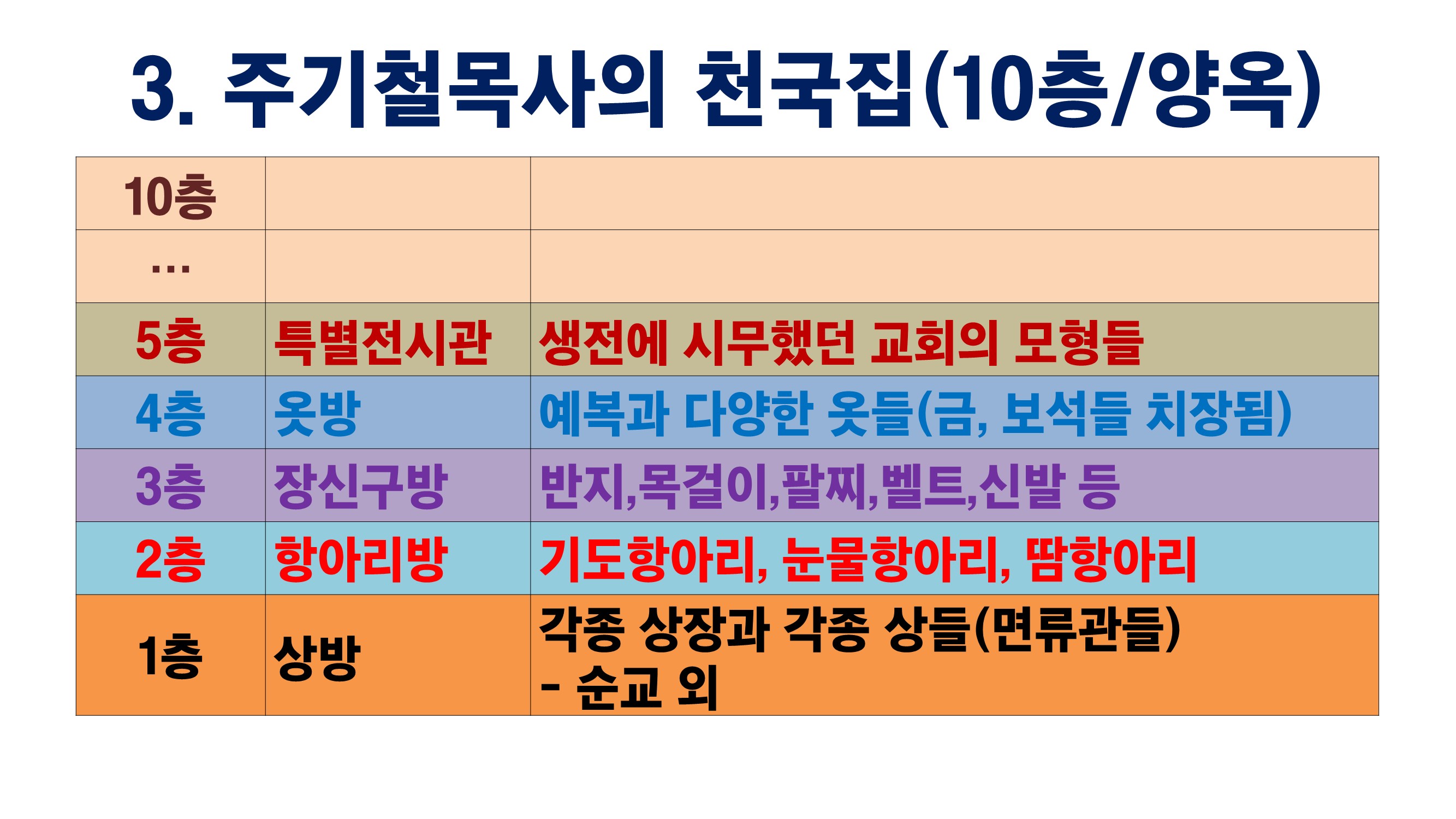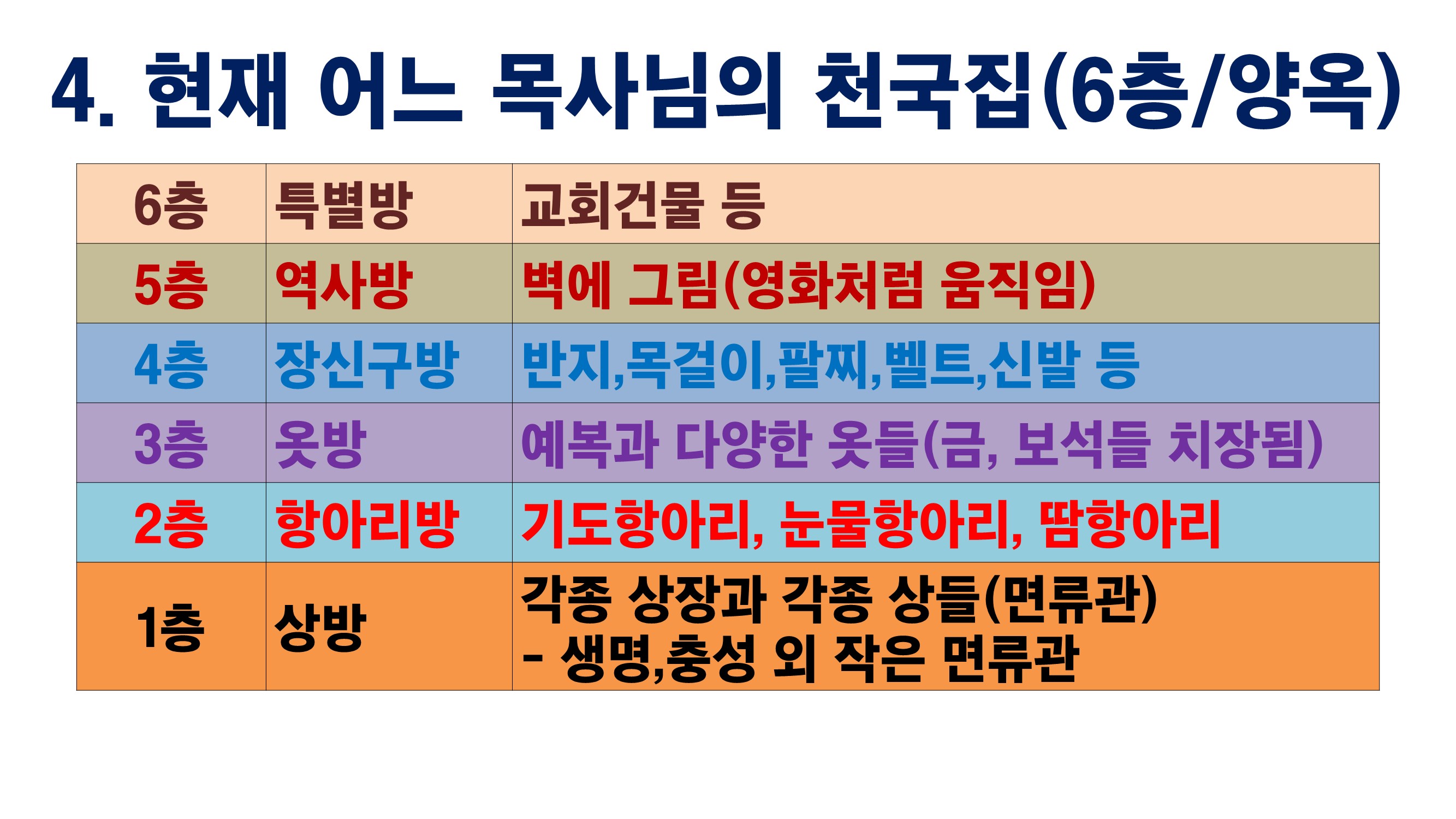 넷째, 지금 현재 살아계신 어느 목사님의 천국집은 6층인데, 양옥으로 지어져 있다.