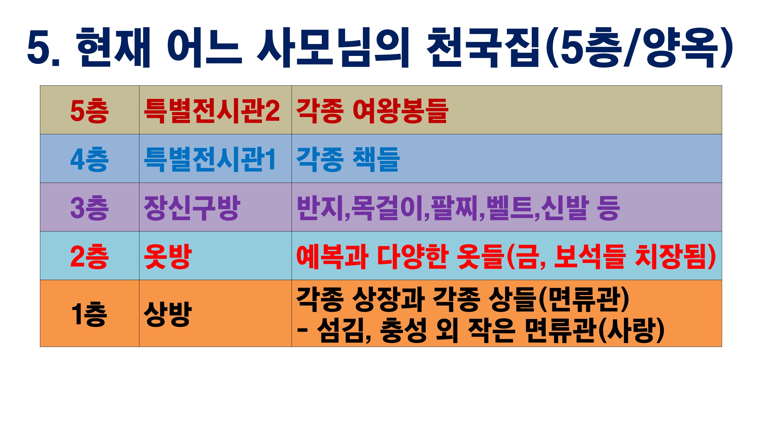다섯째, 지금 현재 살아계신 어느 사모님의 천국집은  5층인데, 양옥으로 지어져 있다.