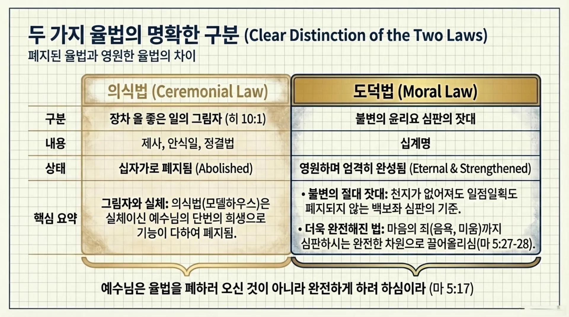 그러나 반대로, 천지가 없어져도 일점일획도 결코 폐지되지 않는 영원한 법이 있으니 그것이 바로 '도덕법', 즉 십계명이다(마 5:17). 십계명은 하나님과 인간, 인간과 이웃 사이에 지켜야 할 불변의 윤리요, 마지막 백보좌 심판대에서 우리의 선악을 달아볼 절대적인 잣대다(계 20:11-15, 고후 5:10). 예수님은 도덕법을 폐지하신 것이 아니라, 행동뿐만 아니라 마음으로 짓는 죄(속으로 품는 음욕, 형제를 미워하는 것)까지 심판하시는 완전한 차원으로 그 법을 더욱 엄격하게 완성하셨다(마 5:27-28).