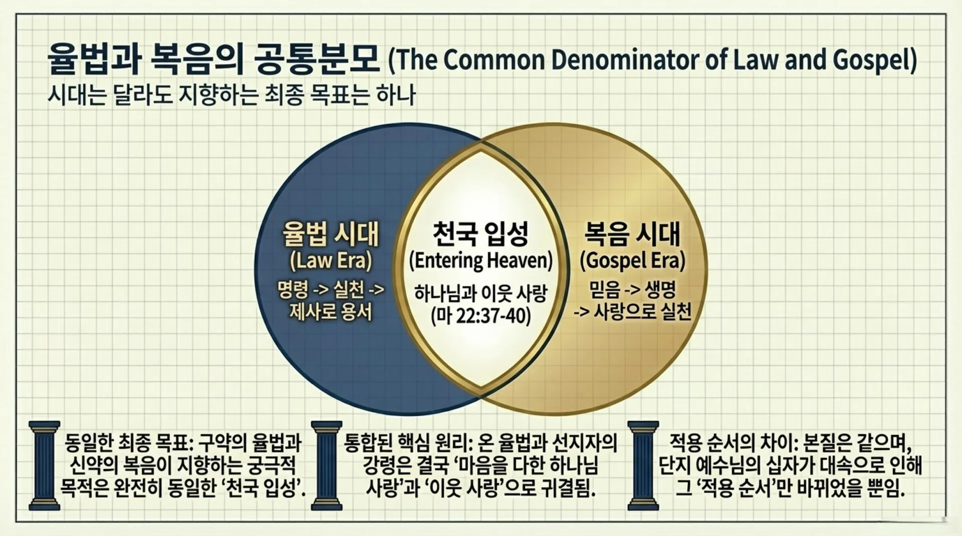 그렇다면 구약의 성도들에게 주어졌던 율법과 신약의 우리에게 주어진 복음은 궁극적으로 무엇을 지향하고 있는가? 놀랍게도 그 둘의 공통분모이자 최종 목표는 완전히 똑같다. 그것은 바로 '천국 입성'이며(마 8:11), 천국에 들어가기 위한 핵심 원리인 '하나님 사랑과 이웃 사랑'이다(마 22:37-40). 이것을 예수께서는 하나로 통합하였다. "내가 너희를 사랑한 것 같이 너희도 서로 사랑하여라"고 하셨기 때문이다.