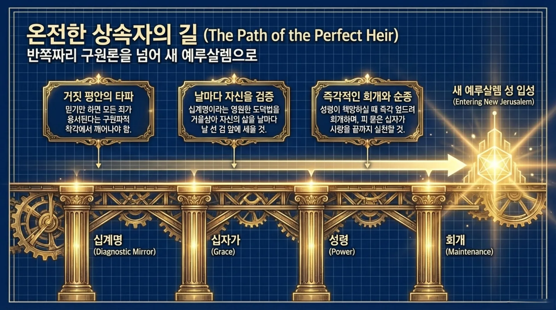 이제 반쪽짜리 구원론의 깊은 잠에서 깨어나야 한다. 믿기만 하면 과거와 미래의 모든 죄가 용서된다는 거짓 평안을 내던지고, 날마다 십계명의 날 선 검 앞에 나 자신을 세우자. 내 육체 속에 합법적으로 들어와 진을 치고 있는 조상의 우상 숭배의 죄와 나의 자범죄를 매일매일 회개 기도문으로 자백하여 씻어내어야 한다. 진정한 이기는 자는 죄짓지 않는 완벽한 자이기보다는, 내 안의 성령이 책망하실 때 즉각적으로 무릎 꿇고 악한 영을 토해내는 자다. 이 치열한 회개와 피 묻은 십자가 사랑의 실천을 통해, 마침내 우리 모두가 행위책의 부끄러운 기록을 다 지워내고 새 예루살렘 성에 넉넉히 입성하는 영광의 상속자들이 되기를 우리 주 예수 그리스도의 이름으로 간절히 바란다.