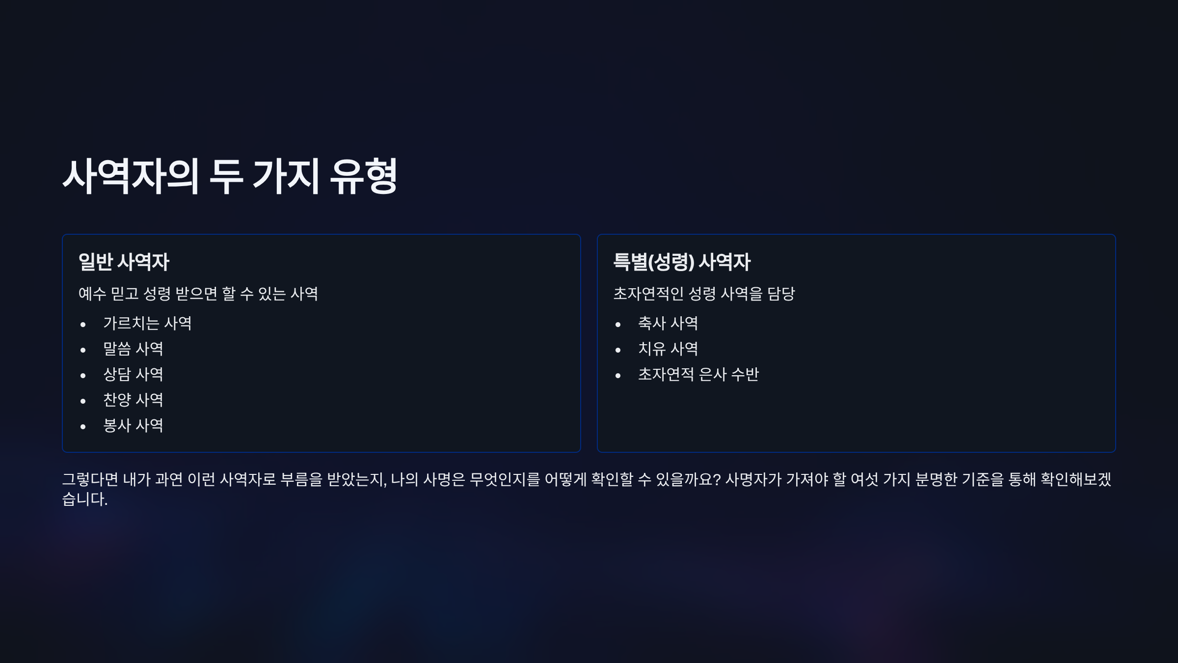 사역자는 크게 일반 사역자와 특별(성령) 사역자로 나눌 수 있다. 일반 사역은 예수 믿고 성령 받으면 할 수 있는 사역으로서, 가르치는 사역, 말씀 사역, 상담 사역, 찬양 사역, 봉사 사역 등을 가리킨다. 반면 특별 사역은 축사와 치유와 같은 초자연적인 성령 사역을 가리킨다. 특히 성령사역은 주로 축사 사역과 치유 사역으로 구분된다. 여기에는 예언 사역이 들어가지 않는다. 왜냐하면 예수께서도 병을 고치고 귀신을 쫓아내라고 하셨지 예언하라고는 하지 않으셨기 때문이다. 그런데 이처럼 특수 사역인 축사 사역이나 치유 사역 같은 성령의 역사는 초자연적인 은사가 수반되어지는 사역자가 담당하는 것이 일반적이다. 그렇다면 내가 과연 이런 사역자로 부름을 받았는지, 나의 사명은 무엇인지를 어떻게 확인할 수 있는가? 이번 말씀은 사명자가 가져야 할 여섯 가지 분명한 기준이 무엇인지를 통해 나의 소명이 무엇이며 어떤 사명을 가진 것인지를 확인할 수 있게 되기를 바란다.