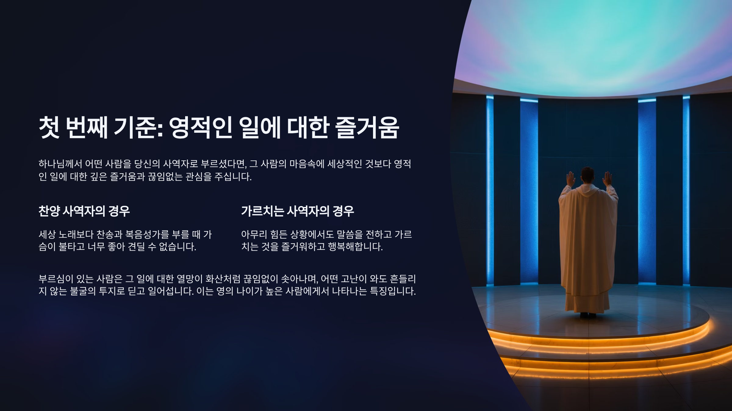 하나님께서 어떤 사람을 당신의 사역자로 부르셨다면, 그 사람의 마음속에 세상적인 것보다 영적인 일에 대한 깊은 즐거움과 끊임없는 관심을 주신다. 예를 들어, 세상 노래보다 찬송과 복음성가를 부를 때 가슴이 불타고 너무 좋아 견딜 수 없다면 그는 찬양 사역자로 부름받았을 가능성이 높다. 가르치는 사역에 은사가 있다면 아무리 힘든 상황에서도 말씀을 전하고 가르치는 것을 즐거워하고 행복해한다.