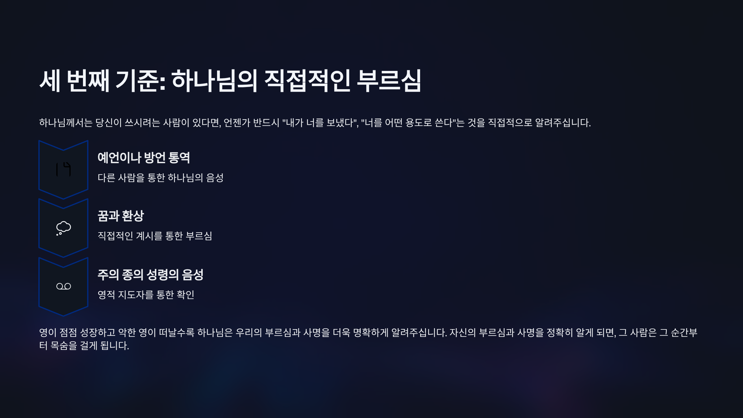 하나님께서는 당신이 쓰시려는 사람이 있다면, 하나님께서는 언젠가 반드시 “내가 너를 보냈다”, “너를 어떤 용도로 쓴다”는 것을 직접적으로 알려주신다. 이 부르심은 누군가를 통해서 예언이나 방언 통역, 혹은 꿈과 환상, 또는 주의 종의 성령의 음성을 통해 나타날 수 있다. 처음에는 나의 영적인 수준이 낮아 하나님이 주시는 부르심을 다 이해하지 못하거나 악한 영의 방해로 인하여 조금만 알 수 있지만, 영이 점점 성장하고 악한 영이 떠날수록 하나님은 우리의 부르심과 사명을 더욱 명확하게 알려주신다.