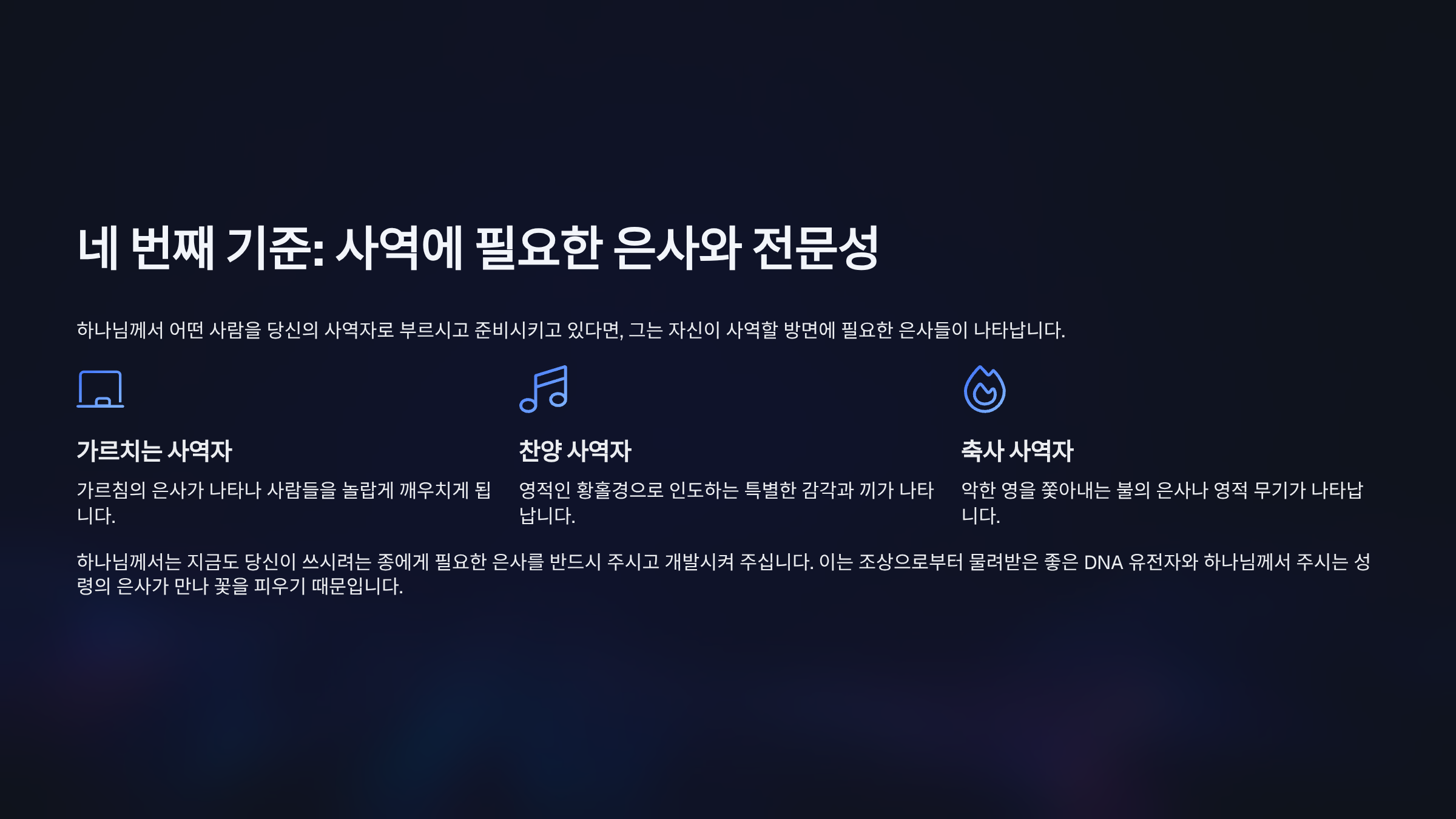 넷째, 사역에 필요한 은사가 나타나고 전문성이 구비된다는 것이다.
