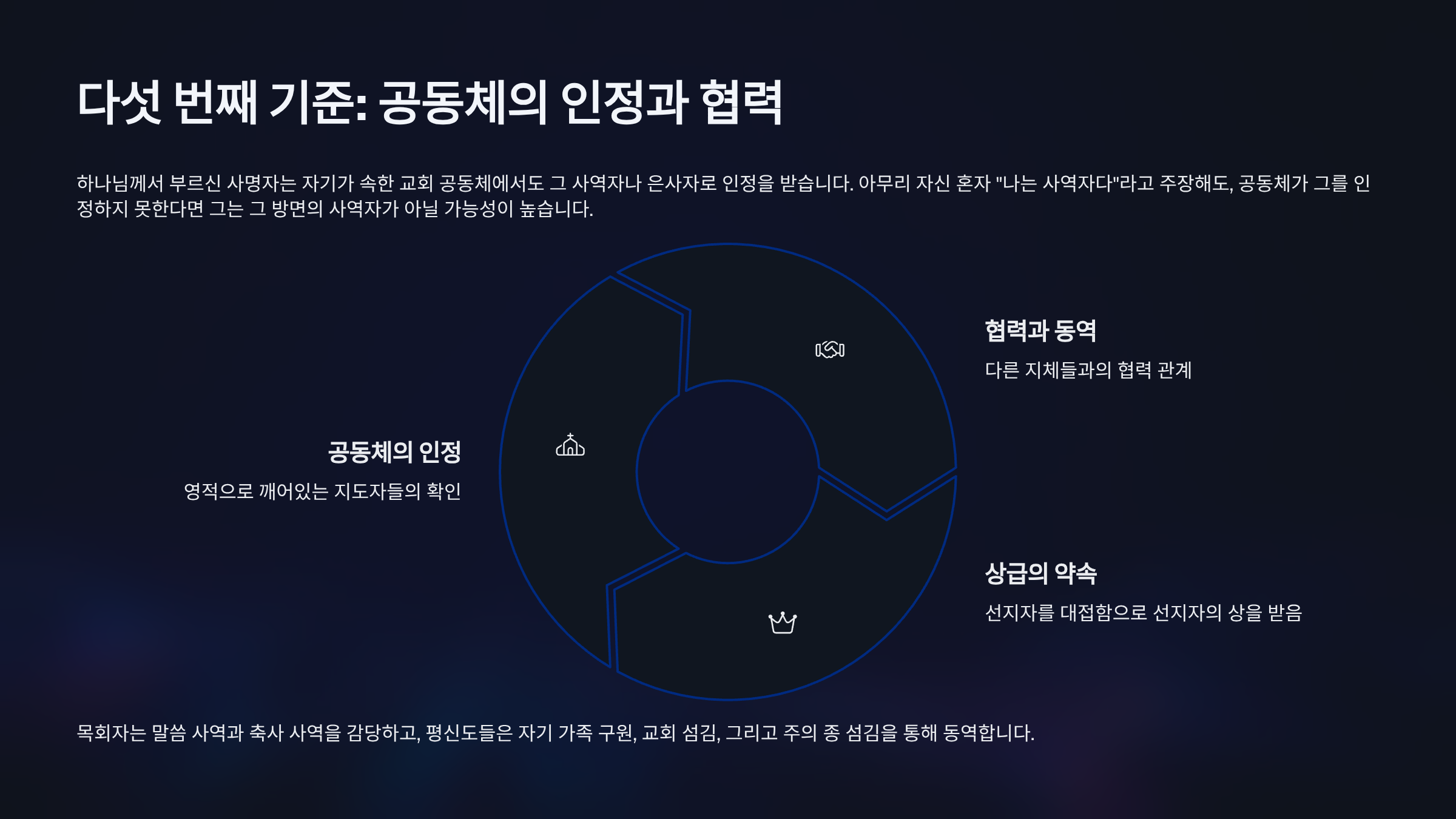 물론 공동체의 인정이 항상 먼저 오는 것은 아니다. 때로는 먼저 순종하고 나아갈 때 공동체가 나중에 인정할 수도 있다. 그러나 결국 사명자는 공동체 안에서 그 사명을 감당하며 다른 지체들과 협력해야 한다. 목회자는 말씀 사역과 축사 사역을 감당하고, 평신도들은 세 가지 사명, 즉 자기 가족 구원, 교회 섬김, 그리고 주의 종 섬김을 통해 동역한다. 평신도가 주의 종을 물질이나 시간, 은사로 도울 때, 주의 종은 더 큰 힘을 얻어 사명을 감당할 수 있으며, 평신도 역시 선지자를 대접함으로 선지자의 상을 받듯 하늘의 상급을 받게 된다.