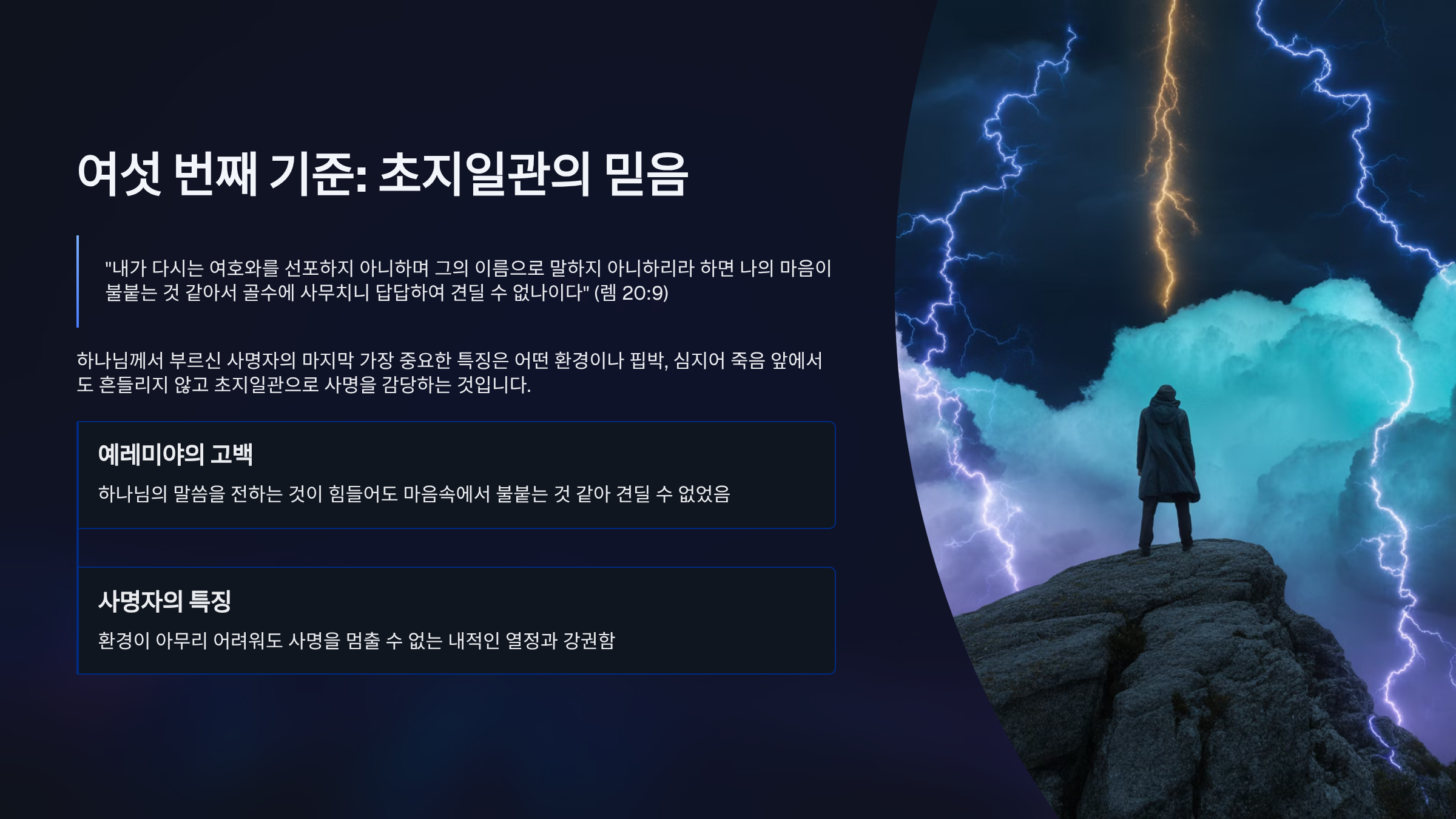 하나님께서 부르신 사명자의 마지막 가장 중요한 특징은 어떤 환경이나 핍박, 심지어 죽음 앞에서도 흔들리지 않고 초지일관(初志一貫)으로 사명을 감당하는 것이다. 예레미야 선지자는 하나님의 말씀을 전하는 것이 너무 힘들어 다시는 여호와를 선포하지 않겠다고 결심했지만, 그의 마음속에서 불붙는 것 같아 견딜 수 없었다고 고백하였다.