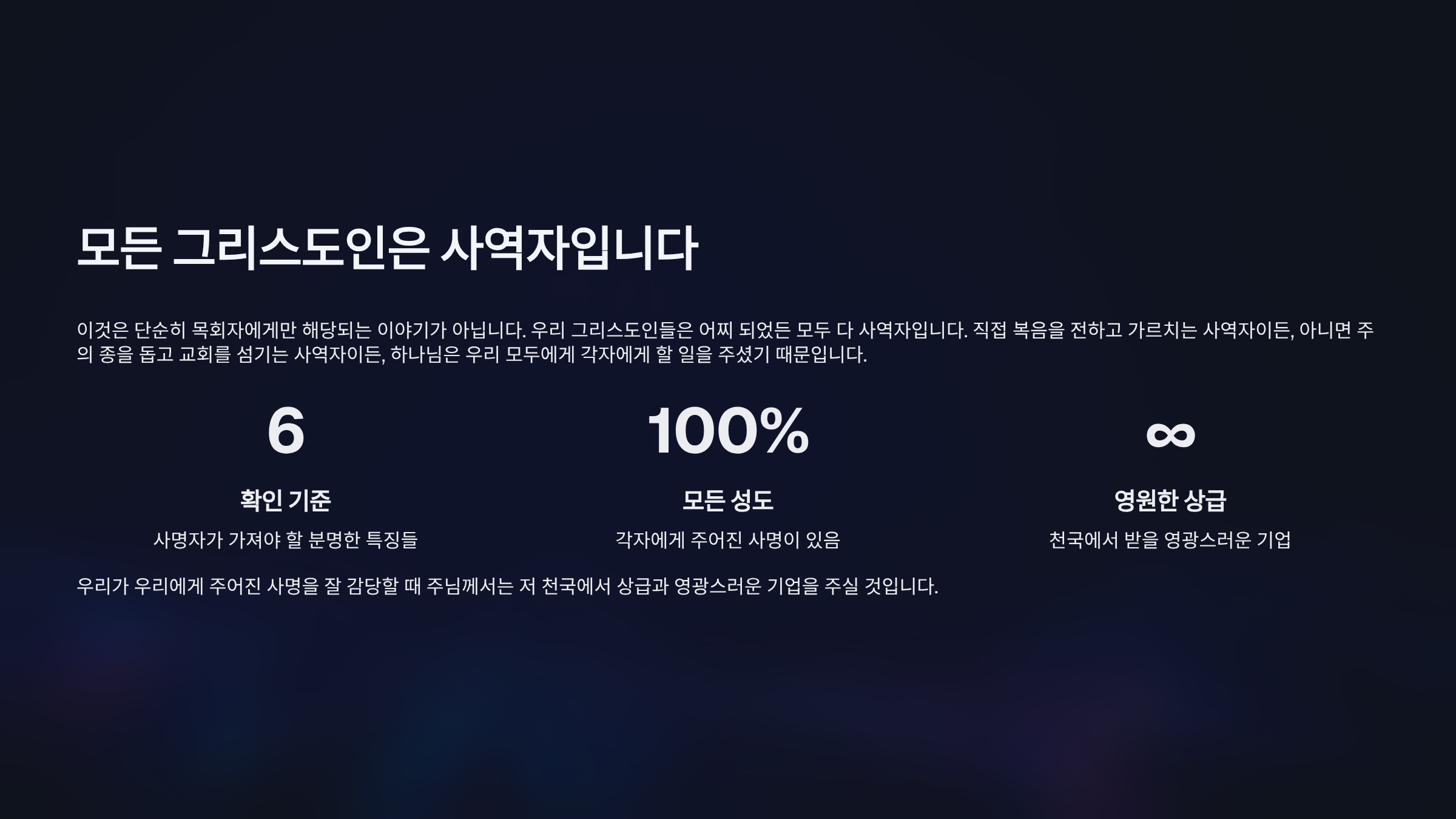 오늘 우리는 나를 향한 주님의 부르심과 나의 사명이 어떻게 확인되어지는지 여섯 가지 기준을 통해 살펴보았다. 하나님께서는 우리가 이 땅에 태어날 때부터 우리가 해야 할 일을 안배하신 뒤에 우리를 준비시키시고, 영적인 즐거움과 관심을 주시며, 직접 부르심을 알려주시고, 필요한 은사를 부어주신다. 또한 공동체의 인정을 통해 확증하시며, 어떤 고난과 핍박에도 흔들리지 않는 초지일관의 믿음으로 사명을 감당하게 하신다. 그런데 이것은 단순히 목회자에게만 해당되는 이야기가 아니다. 우리 그리스도인들은 어찌 되었든 모두 다 사역자다. 왜냐하면 직접 복음을 전하고 가르치는 사역자이든, 아니면 주의 종을 돕고 교회를 섬기는 사역자이든, 하나님은 우리 모두에게 각자에게 할 일을 주셨기 때문이다. 고로 우리가 우리에게 주어진 사명을 잘 감당할 때 주님께서는 저 천국에서 상급과 영광스러운 기업을 주실 것이다.