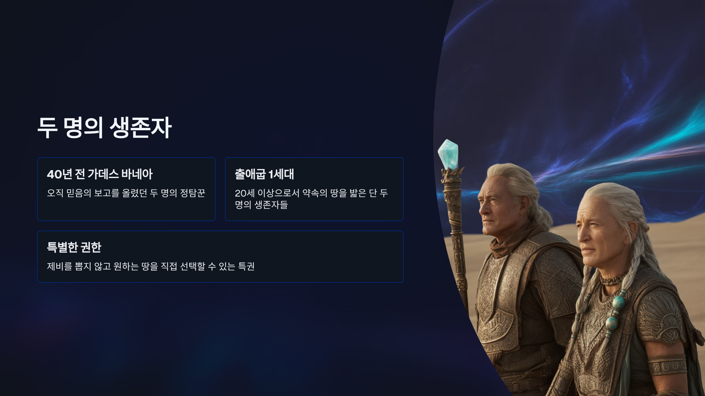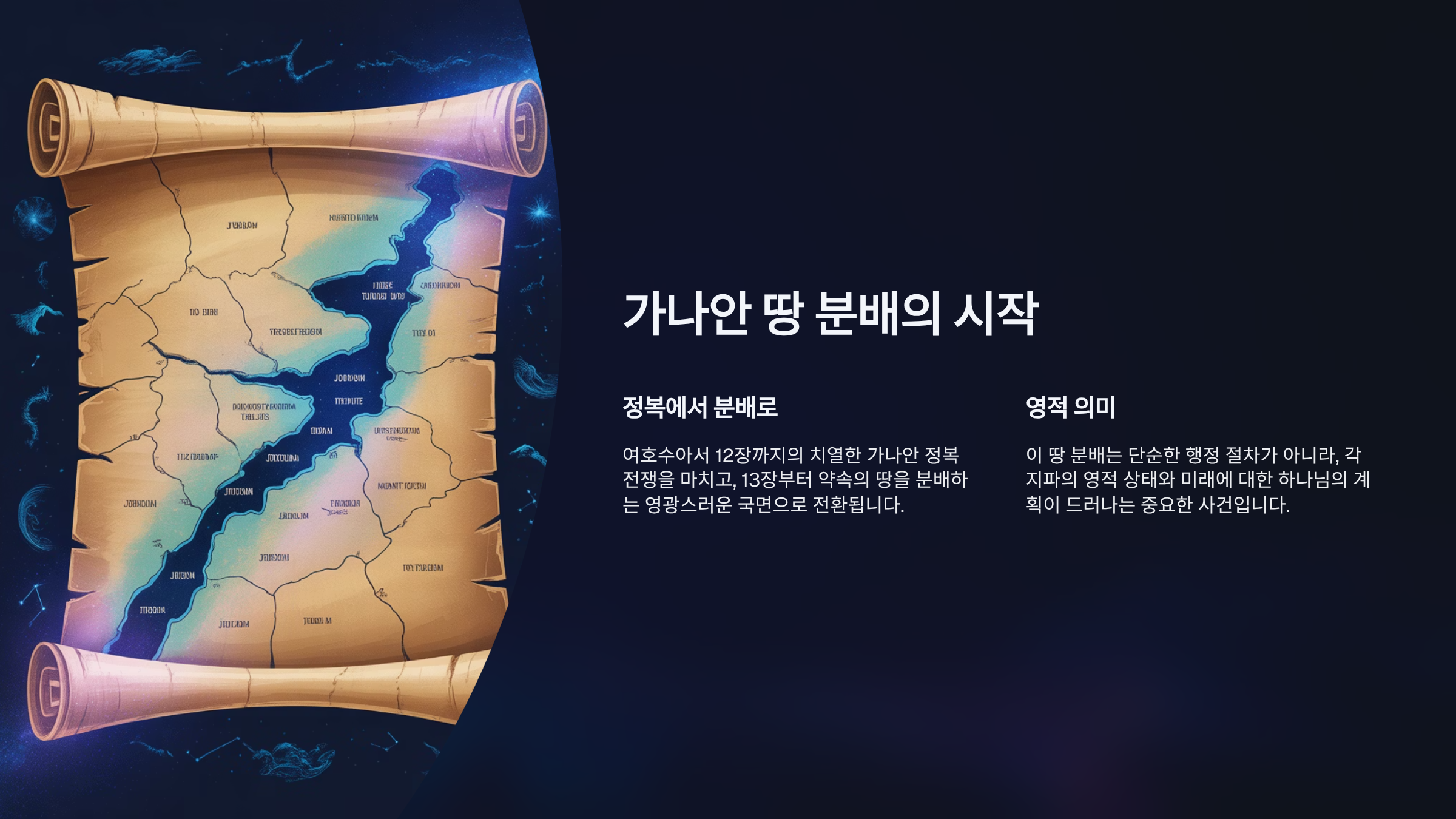 여호수아서는 12장까지의 치열했던 가나안 정복 전쟁을 마치고, 13장부터 약속의 땅을 분배하는 영광스러운 국면으로 전환된다. 이 땅 분배는 단순히 영토를 나누는 행정 절차가 아니라, 각 지파의 영적인 상태와 미래에 대한 하나님의 계획이 드러나는 중요한 사건이라고 할 수 있다. 그리고 이 과정의 시작과 끝에는 두 명의 위대한 인물이 있다. 그들은 바로 갈렙과 여호수아이다.