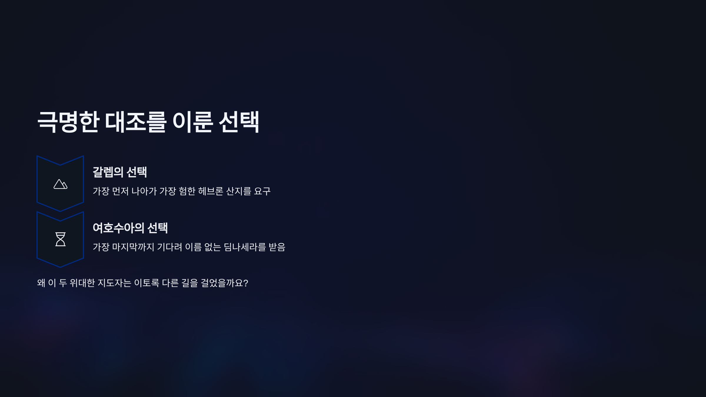 갈렙과 여호수아는 출애굽 1세대 중 유일하게 약속의 땅을 밟은 믿음의 용사들이다. 하나님께서는 그들의 충성을 인정하시어, 다른 지파들처럼 제비를 뽑지 않고 원하는 땅을 직접 선택하여 기업으로 삼을 수 있는 특별한 권한을 주셨다. 그러나 그들이 보여준 리더십과 기업의 선택은 극명한 대조를 이룬다.