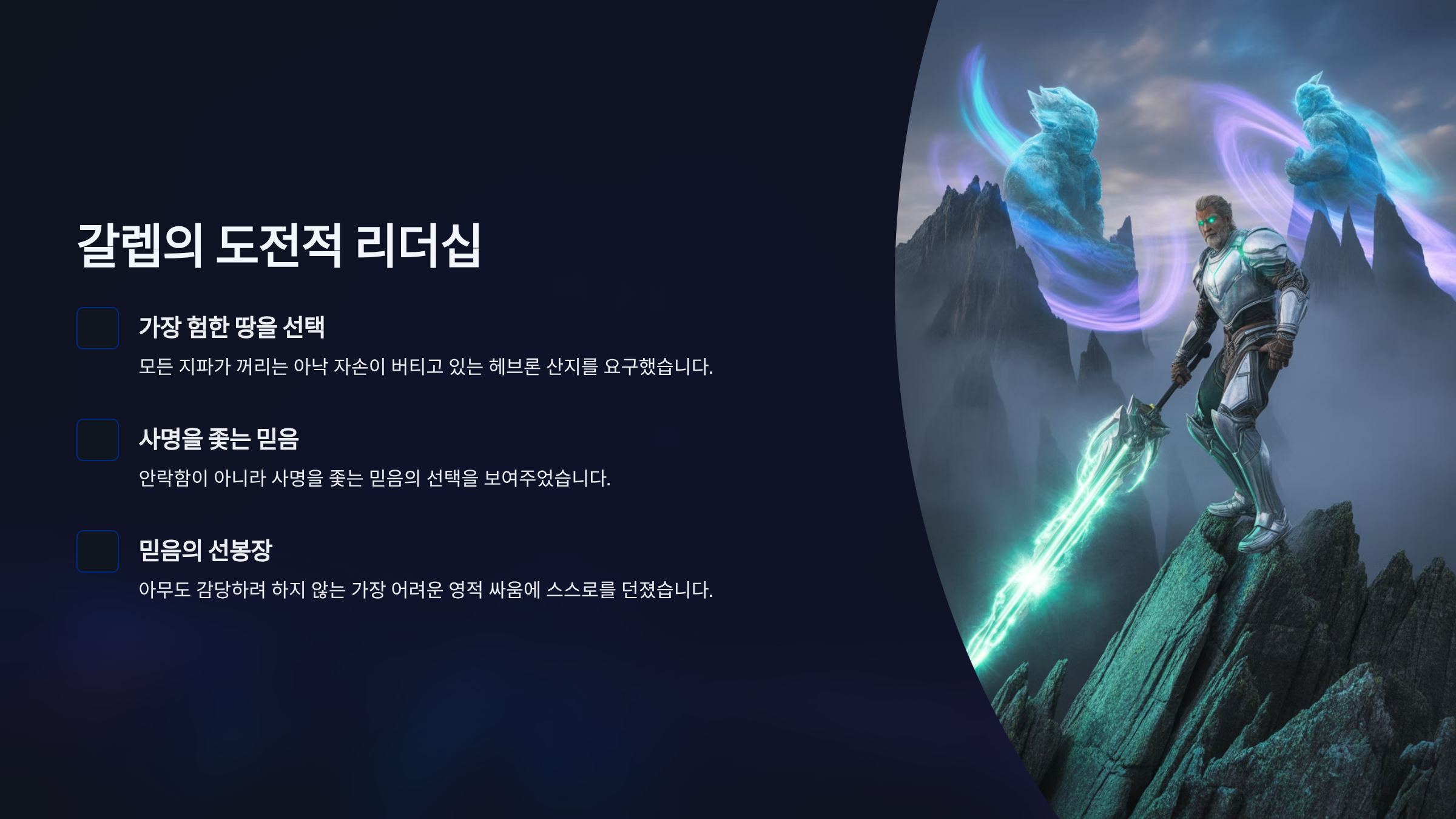 첫째로, 갈렙은 ‘도전적이고 적극적인’ 리더십을 보여주었다. 그는 모든 지파가 꺼리는 가장 험하고 위험한 땅, 아직 거인 아낙 자손이 버티고 있는 헤브론 산지를 요구한다. 이는 안락함이 아니라 사명을 좇는 믿음의 선택이다. 그는 공동체 안에서 아무도 감당하려 하지 않는 가장 어려운 영적 싸움에 스스로를 던져, 믿음의 선봉장이 되기를 주저하지 않았다. 그의 기업 선택은 ‘남들이 가지 않는 길을 개척하는 용기’가 무엇인지를 보여준 것이다.