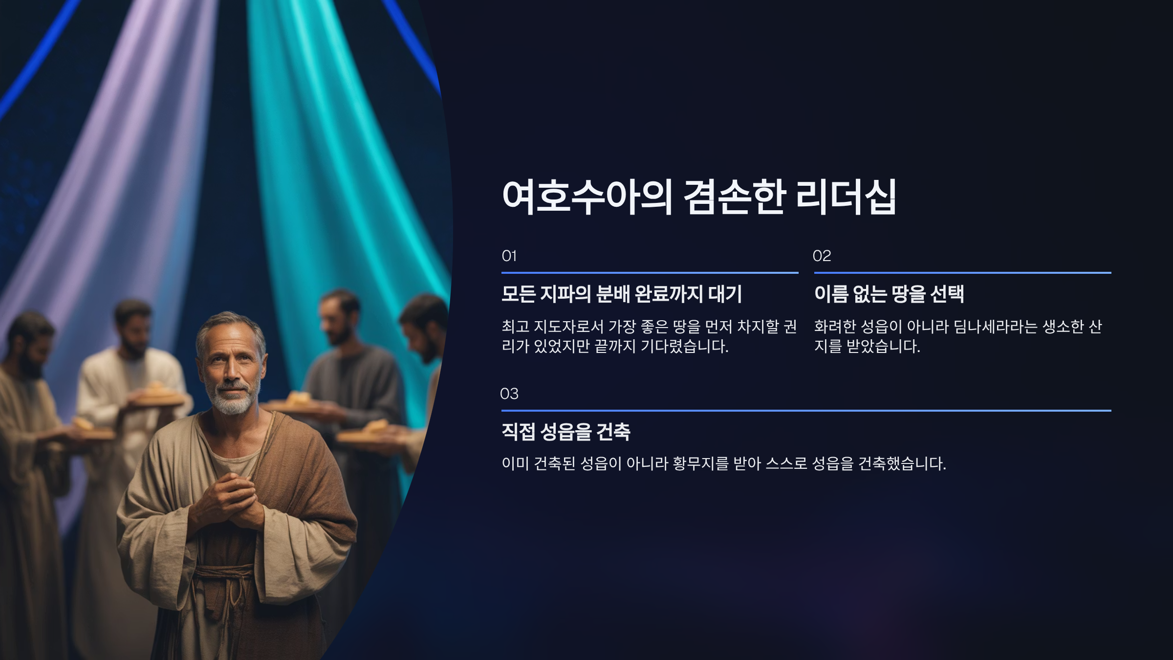 반면, 둘째로, 여호수아는 ‘겸손하고 희생적인’ 리더십을 보여주었다. 최고 지도자로서 가장 좋은 땅을 먼저 차지할 권리가 있었음에도, 그는 모든 열두 지파의 땅 분배가 완전히 끝날 때까지 자신의 기업을 요구하지 않았다. 그리고 마침내 그가 받은 땅은 화려한 성읍이 아니라, 이름조차 생소한 딥나세라 산지였다. 심지어 그는 이미 건축된 성읍에 들어간 것이 아니라, 황무지를 받아 스스로 성읍을 건축했다. 그의 기업 선택은 ‘자신의 권리를 주장하기보다 공동체 전체를 먼저 섬기는 희생’이 무엇인지를 보여준 것이다.