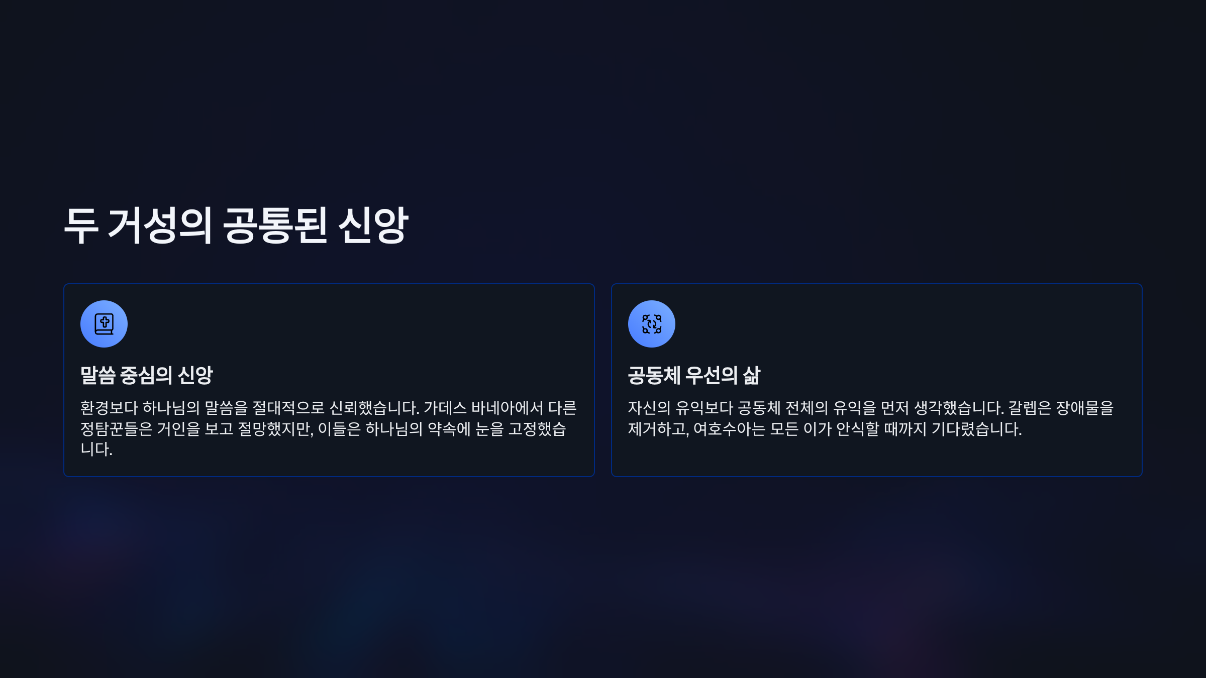 첫 번째 공통점은 ‘환경보다 하나님의 말씀을 절대적으로 신뢰했다’는 것이다. 민수기 13장의 가데스 바네아 정탐 보고 사건에서, 다른 열 명의 정탐꾼들은 눈앞의 아낙 자손이라는 거대한 ‘환경’을 보고 절망을 보고했다. 그러나 갈렙과 여호수아는 그들의 눈을 환경이 아닌, “그 땅을 우리에게 주시리라”고 하신 하나님의 ‘약속의 말씀’에 고정했다. 이 말씀 중심의 신앙은 40년의 광야 생활과 수많은 전쟁 속에서도 결코 흔들리지 않았고, 마침내 그들을 약속의 땅으로 이끌었다.
