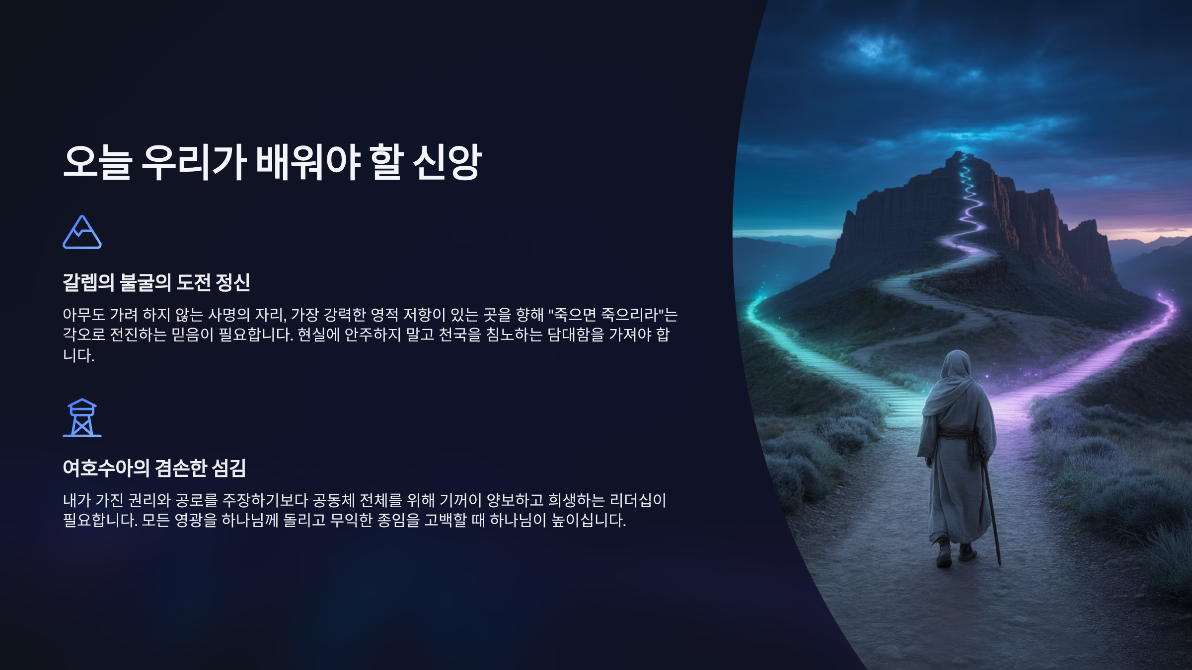 그중에 하나는 갈렙과 같은 ‘불굴의 도전 정신’이다. 아무도 가려 하지 않는 사명의 자리, 가장 강력한 영적 저항이 있는 곳을 향해 “죽으면 죽으리라”는 각오로 전진하는 믿음이 필요한 것이다. 현실에 안주하려는 신앙을 버리고, 천국은 침노하는 자의 것이라는 말씀처럼 더 큰 기업을 향해 담대하게 도전해야 하는 것이다.