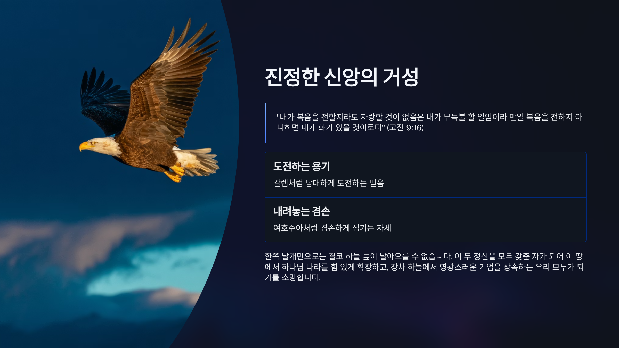 결국 진정한 신앙의 거성은 이 두 가지 정신, 곧 ‘도전하는 용기’와 ‘내려놓는 겸손’을 모두 갖춘 사람이라고 할 수 있다. 한쪽 날개만으로는 결코 하늘 높이 날아오를 수 없다. 갈렙처럼 담대하게 도전하되, 여호수아처럼 겸손하게 섬기는 자가 되어, 이 땅에서 하나님 나라를 힘 있게 확장하고, 장차 하늘에서 영광스러운 기업을 상지하는 우리 모두가 되어야 할 것이다.