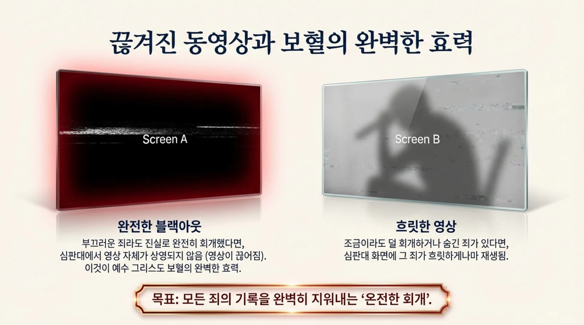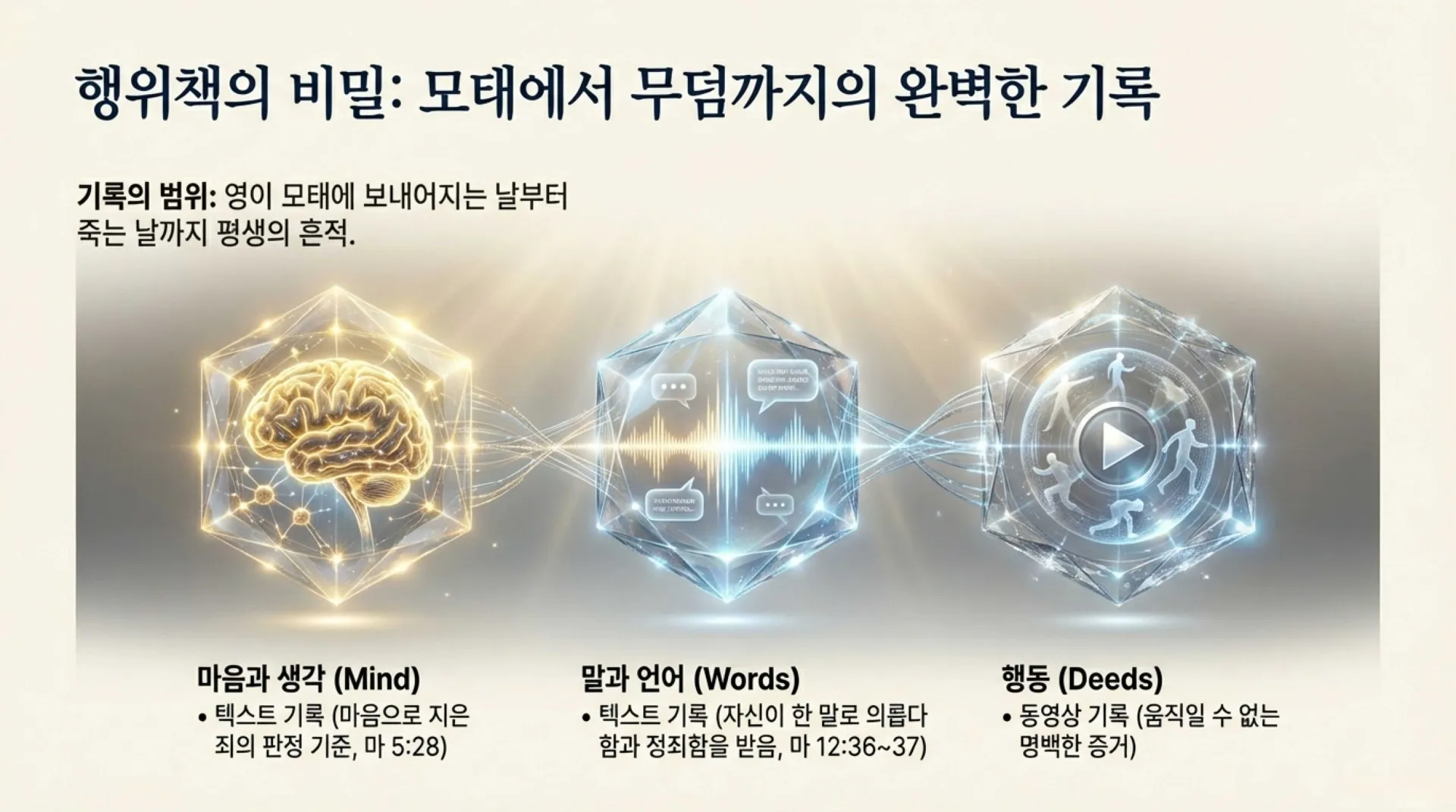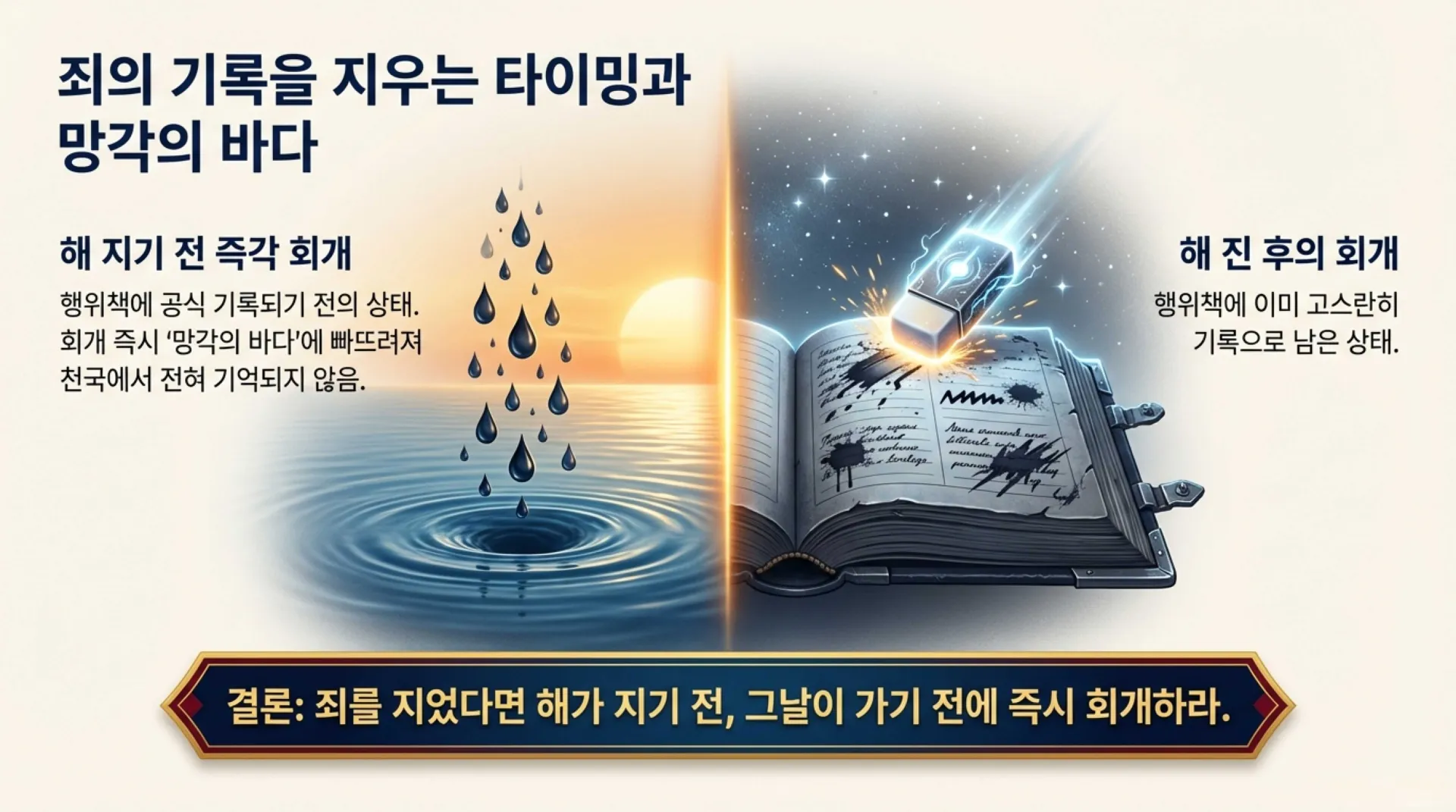 그렇다면, 생명책과 행위책의 어떤 공통적인 특징이 있는가? 좀 전에도 말씀드렸지만 첫째, 생명책이나 행위책은 모든 사람의 심판을 위한 책이라는 점에서 같은 것이다. 그런데 이 책들 중에서 '생명책'은 새 예루살렘 성 안에 들어갈 자들인지 아닌지 그 사람의 최종적인 운명을 알려 주는 책이다. 또한 세부적으로는 천국에서 그 사람이 받을 상을 알려주는 책이다. 그런데 행위책은 이와는 조금 달라서 한 사람의 마음(생각)과 말과 행위들을 모두 기록하고 있는 책이다. 이 책에 기록된 내용은 장차 그가 천국에서 받을 모든 상과 또한 그가 받을 모든 헝벌의 기준이 된다. 둘째, 한 번 생명책이나 행위책에 기록된 것이라도 지워질 수 있다는 점에서도 공통점을 가지고 있다. 생명책에서는 이미 기록된 사람의 이름이 지워지는 것이므로, 이름이 지워지면 절대 안 되는 책이지만, 반면에 행위책은 한 사람이 지은 죄라도 그것이 지워질 수 있는 책이라는 점에서는 둘이 같다. 그렇다면 이미 행위책에 기록된 죄들은 어떻게 지울 수 있는가? 그것은 한 마디로 지은 죄들을 진정으로 회개하는 것이다. 그것이 진실로 회개한 죄라고 가정했을 때에, 그가 해가 지기 전에 지었던 죄들은 아직 행위책에 기록되기 전의 상황이므로 망각의 바다에 곧바로 빠뜨려진다. 그러면 전혀 기억이 나지 않는다. 그런데 해가 진 후에 지었던 죄들이라면 행위책에 고스란히 기록으로 남는다. 그러므로 죄를 회개하려면 즉시 회개하라. 그리고 사람은 어떤 죄든지 죄를 진실로 회개할 때에 그 죄가 지워지는데, 여러 번 지은 죄들은 여러 번 겹쳐 쓴 것이기에 지은 죄의 횟수만큼 회개해야 깨끗이 없어진다는 것을 알 필요가 있다. 그러므로 참다운 회개는 한 번 회개한 죄라면 다시 짓지 않는 회개를 하는 것이다. 그리고 참으로 놀라운 사실은 아무리 부끄러운 죄를 지었다고 할지라도 심판대에서 전혀 방송에 나오지 않는 죄도 있다는 것이다. 그것은 진실로 회개한 죄들이다. 그때에는 그 죄를 볼 수 없다. 왜냐하면 영상이 끊겨서 볼 수 없기 때문이다. 예수님의 피의 효력이 이러한 것이다. 그러나 조금이라도 덜 회개한 죄가 있으면 약간이나마 그 죄가 흐릿하게 보인다는 것이다. 그러므로 기왕 회개할 것 같으면 깨끗이 회개할 수 있기를 바란다. 오늘도 지은 죄 이상을 회개하되, 회개에 합당한 열매를 맺는 회개를 하여서 그날 자신이 지었던 죄들이라 할지라도 모든 사람이 보는 앞에서 전혀 상영되지 않는 기록이 될 수 있기를 바란다.