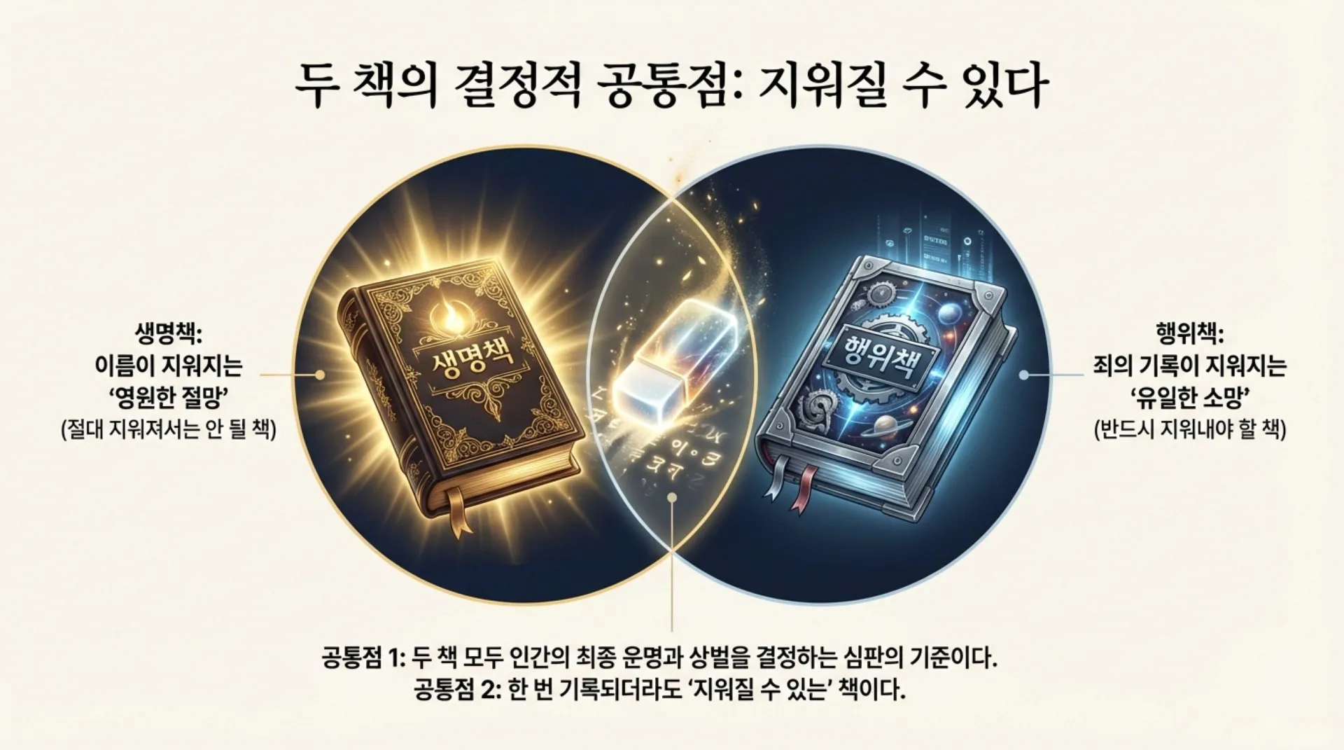 5. 생명책과 행위책의 공통된 특징은 무엇이며, 행위책에서 죄는 어떻게 지워질 수 있는가?