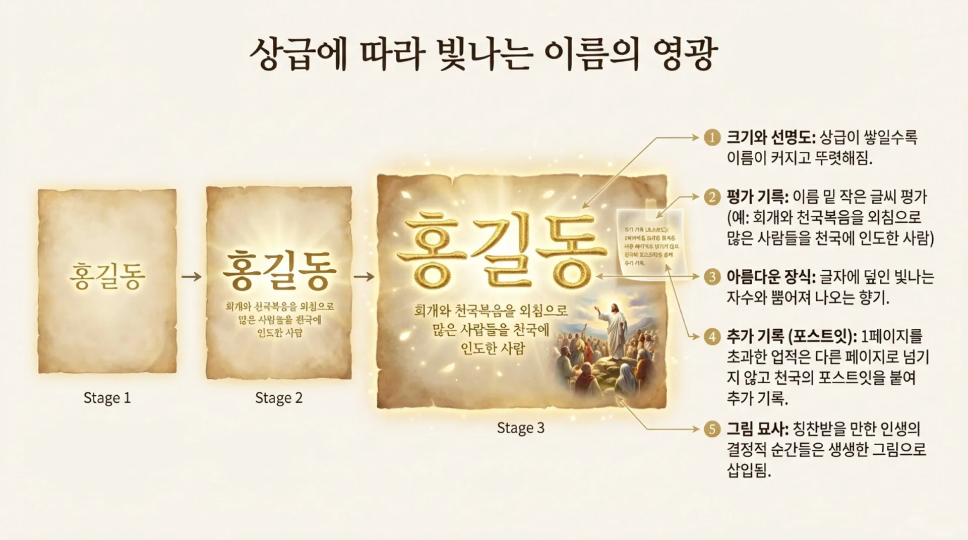 '생명책'이란 사람이 거듭나서 성령을 통해 하나님의 생명을 갖고 있는 자들의 이름이 기록되고 있는 책이다. 이 책에는 사람이 거듭나는 날 그 이름이 기록이 된다. 이 책은 천국에 있는 기록 담당 천사들이 기록하는 책인데, 보통 한 페이지 안에 한 사람의 이름이 기록이 된다. 그런데 천국에 상급이 많이 쌓일수록 그 이름의 크기도 커지고 선명하게 보인다. 그리고 그 이름 밑에는 작은 글씨로 그 사람에 대한 간단한 하나님의 평가가 기록되어 있다. 예를 들어, "회개와 천국복음을 외침으로 많은 사람들을 천국에 인도한 사람". 이런 식이다. 그리고 그 사람이 천국에 상급이 많이 쌓일수록 그 이름은 더 빛나게 되며, 글자에 아름다운 자수가 덮여지기도 하고, 향기가 나기도 한다. 그리고 그가 천국에서 상급받을 일들은 그 이름 아래에 작은 글씨로 기록이 된다. 한 페이지를 다 채운 사람도 있지만 한 페이지에서 조금 밖에 채우지 못한 사람도 있다. 어떤 사람은 한 페이지를 초과하는 업적을 남기기도 하는데 그때에는 다른 페이지로 넘어가지 아니하고 포스트 잇 같은 것을 붙여서 그 사람의 행위를 기록하기도 한다. 그리고 생명책에는 그 사람이 정말 칭찬받을 만한 부분이나 인생에서 중요한 순간은 그림으로 그려져 있기도 한다.