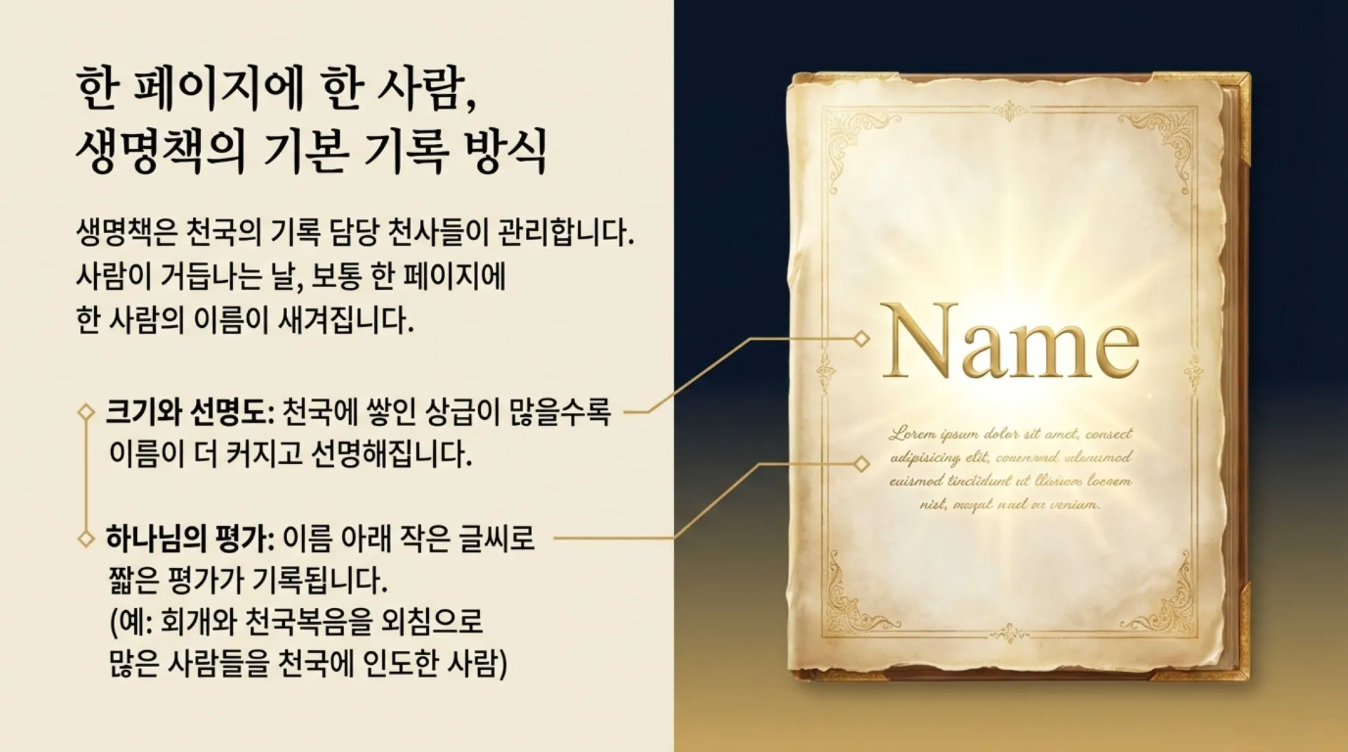 생명책에 관한 천국의 실제 모습에 대해서는 다음 시간에 행위책과 더불어 계속해서 살펴보도록 하자.