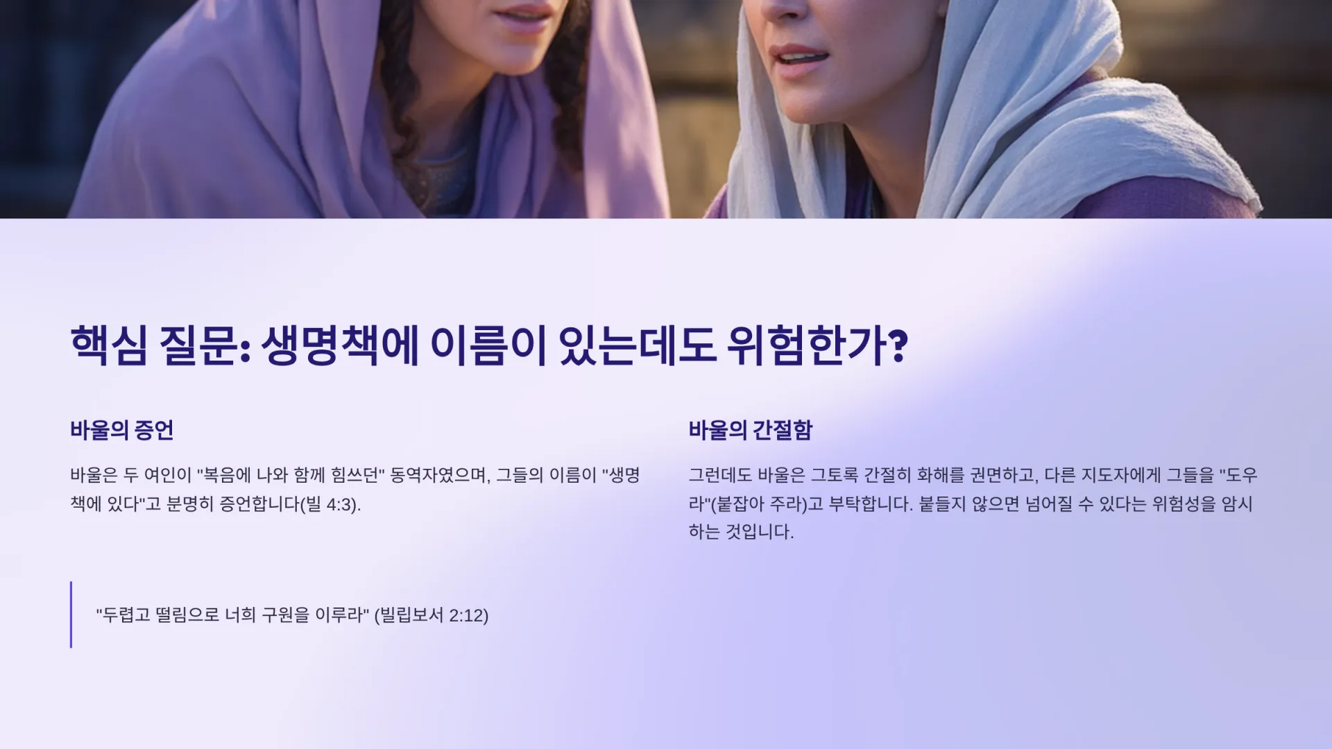 바로 그 점이 문제의 심각성을 더한다. 그토록 헌신적이었고 생명책에 이름까지 기록된 지도자급 여인들이, 지금은 “같은 마음을 품지 못하고”(빌 4:2) 서로 싸우고 있었기 때문이다. 이는 빌립보 교회 전체의 분열로 이어질 수 있는 치명적인 위기였다.