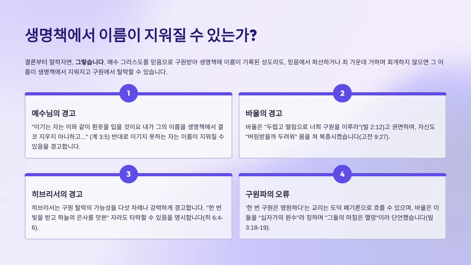 그렇다. 하나님께서는 우리가 구원받기를 원하시며 오래 참으신다(벧후 3:9). 하지만 우리가 자유의지로 주님을 버리고(데마처럼, 딤후 4:10) 죄를 회개하지 않는다면, 그 구원은 결코 안전하게 보장되지 않는다. 생명책에 이름이 기록되는 것은 ‘썼다 지웠다’ 하는 가벼운 일이 아니지만, 하나님은 분명히 생명책에 기록된 이름이 ‘지워질 수 있음’을 경고하셨다.
