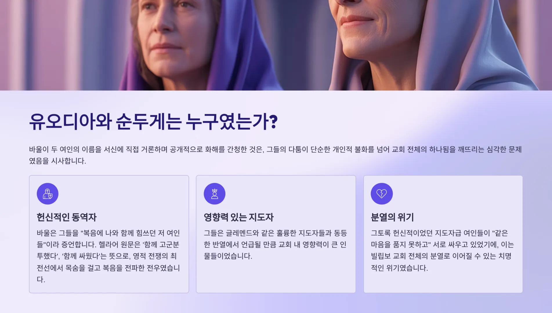 그런데 유오디아와 순두게는 결코 평범한 성도들이 아니었다. 바울은 그들을 “복음에 나와 함께 힘쓰던 저 여인들”(빌 4:3)이라고 증언한다. 헬라어 원문(συνήθλησάν μοι, 쉬네틀레산 모이)은 ‘나와 함께 고군분투했다’, ‘함께 싸웠다’는 뜻으로, 그들이 바울과 함께 영적 전쟁의 최전선에서 목숨을 걸고 복음을 전파했던 헌신적인 동역자요 전우였음을 보여준다. 그들은 글레멘드와 같은 훌륭한 지도자들과 동등한 반열에서 언급될 만큼 교회 내 영향력이 큰 인물들이었다.