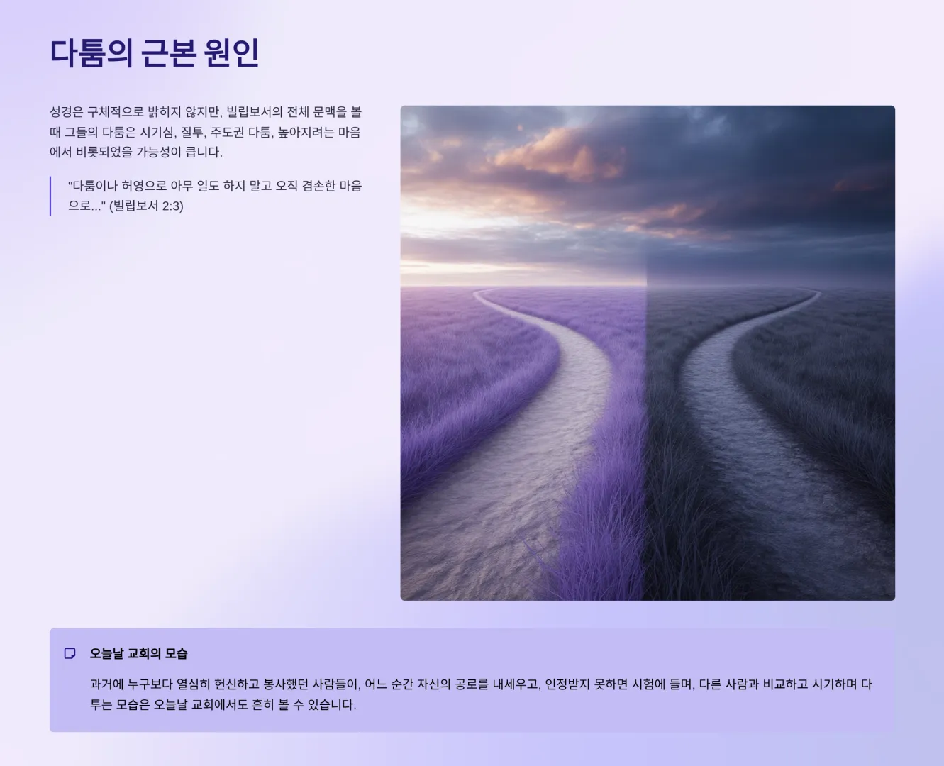 그렇다면 그들이 다툰 이유는 무엇일까? 성경은 구체적으로 밝히지 않지만, 빌립보서의 전체적인 문맥(빌 1:15의 ‘투기와 분쟁’, 2:3의 ‘다툼이나 허영’)을 볼 때, 이는 시기심, 질투, 주도권 다툼, 높아지려는 마음 등에서 비롯되었을 가능성이 크다. 이들의 다툼은 오늘날 교회 안에서 흔히 볼 수 있는 갈등의 모습과 정확히 일치한다. 과거에는 누구보다 열심히 헌신하고 봉사했던 사람들이, 어느 순간 자신의 공로를 내세우고, 인정받지 못하면 시험에 들며, 다른 사람과 비교하고 시기하며 다툰다. 그 결과 교회는 하나 되지 못하고 분열의 아픔을 겪는다.