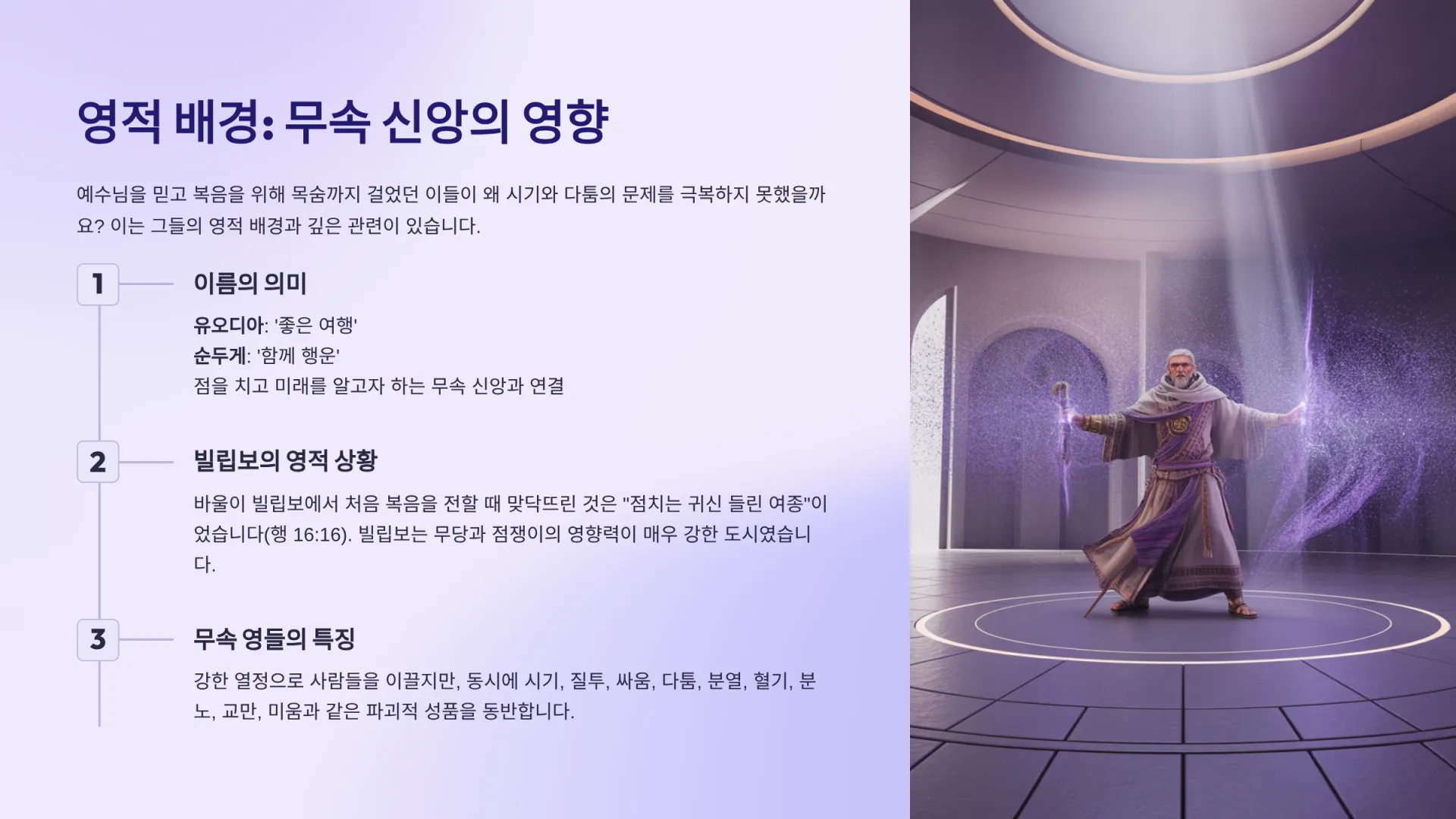 유오디아와 순두게는 바로 이 무당(점쟁이)의 영에 깊이 영향을 받은 가문 출신이었을 가능성이 높다. 그들은 예수님을 믿은 후, 이 영들의 영향으로 복음을 전하는 데에는 뜨거운 열정을 보였지만(‘복음에 나와 함께 힘쓰던’), 자신들 속에 깊이 뿌리박힌 시기, 질투, 다툼의 영들은 회개를 통해 처리하지 못했던 것이다.