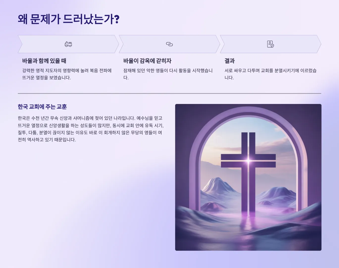이는 오늘날 한국 교회 성도들에게도 동일하게 적용된다. 한국은 수천 년간 무속 신앙과 샤머니즘에 젖어 있던 나라이다. 예수님을 믿고 뜨거운 열정으로 신앙생활을 하는 성도들이 많지만, 동시에 교회 안에 유독 시기, 질투, 다툼, 분열, 혈기, 분노가 끊이지 않는 이유도 바로 이 회개하지 않은 무당의 영들이 여전히 역사하고 있기 때문이다.