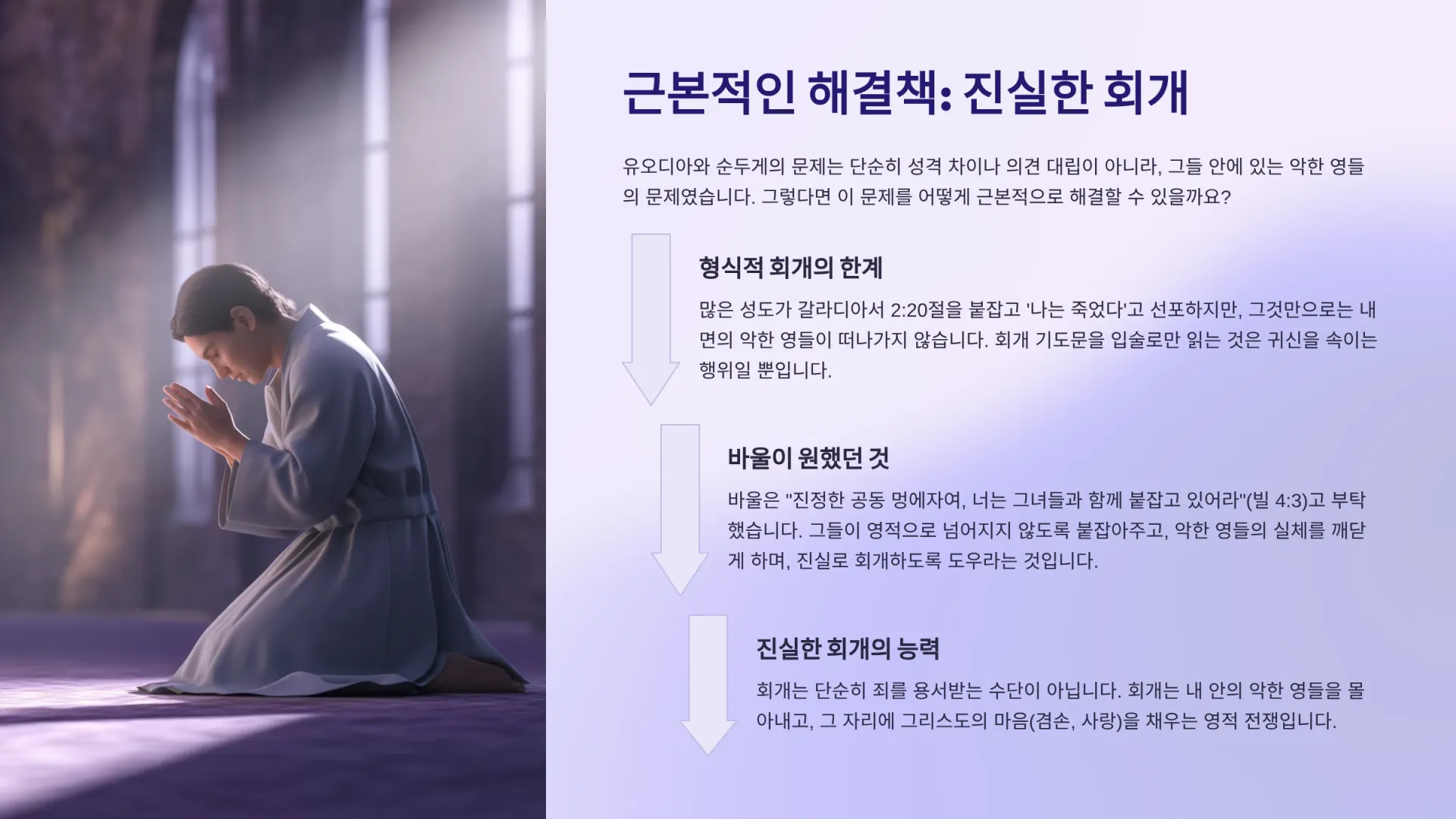 오늘날 우리에게 이 ‘도움’은 회개의 길을 가르쳐 주는 것이다. 30년을 믿었어도 자신의 영적 실상을 모르고 성품이 변하지 않는 성도들에게, 회개 기도문과 같은 도구를 통해 자신의 죄와 조상의 죄를 구체적으로 깨닫고 자백하게 함으로써, 실제로 악한 영들이 떠나가고 성품이 변화되도록 돕는 것이다(요일 1:9). 회개는 단순히 죄를 용서받는 수단이 아니다. 회개는 내 안의 악한 영들을 몰아내고, 그 자리에 그리스도의 마음(겸손, 사랑)을 채우는 영적 전쟁이다. 그러므로 유오디아와 순두게에게는 이 진실한 회개가 없었기에, 헌신적인 사역자였음에도 불구하고 다툼의 죄에 빠져 생명책에서 이름이 지워질 위험에 처했던 것이다.