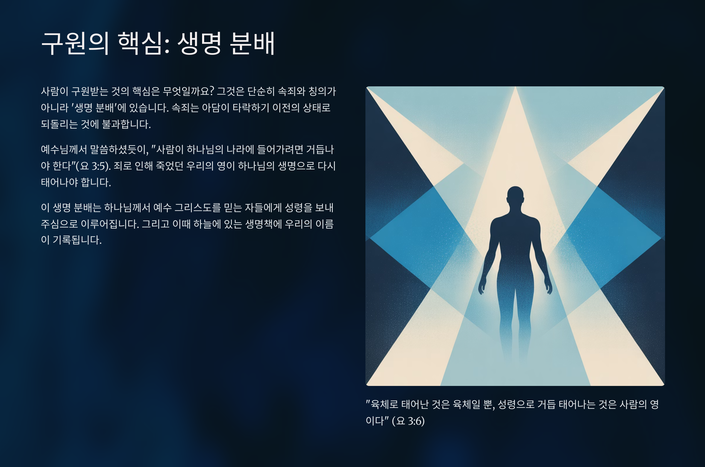 사람이 구원받는 것의 핵심은 무엇인가? 그것은 속죄와 칭의인가 아니면 생명 분배인가? 결론적으로 그것은 사실 생명 분배에 있다. 왜냐하면 속죄는 아담이 타락하기 이전의 상태로 되돌리는 것 뿐이기 때문이다. 사람이 구원받아서 천국에 들어가려면 속죄만으로 불가능한 것이다. 왜냐하면 우리 주 예수께서 친히 말씀하시기를 사람이 하나님의 나라에 들어가려면 거듭나야 한다고 말씀하셨기 때문이다(요3:5). 그러므로 사람이 구원받는 것의 핵심은 ‘생명’에 있는 것이다. 이때 생명 분배란 사람의 영에게 하나님의 생명이 분배되는 것을 가리킨다. 그렇다. 죄로 인해 죽었던 우리의 영이 하나님의 생명으로 다시 태어나야 하는 것이다. 그래야 사람의 영 속에 드디어 하나님의 생명에 들어오게 되기 때문이다. 그러므로 예수께서는 육체로 태어는 것은 육체일 뿐, 성령으로 거듭 태어나는 것은 사람의 영이라고 말씀하셨다(요3:6). 그러므로 속죄와 칭의가 구원을 위한 전단계라고 말한다면, 중생은 구원을 위한 후단계인 것이다. 고로 구원에 있어서 속죄와 칭의가 죄의 문제를 해결하기 위한 소극적인 측면을 가리킨면, 중생은 하나님의 생명을 받아 새로운 피조물로 거듭나는 적극적인 측면을 가리키는 것이다.