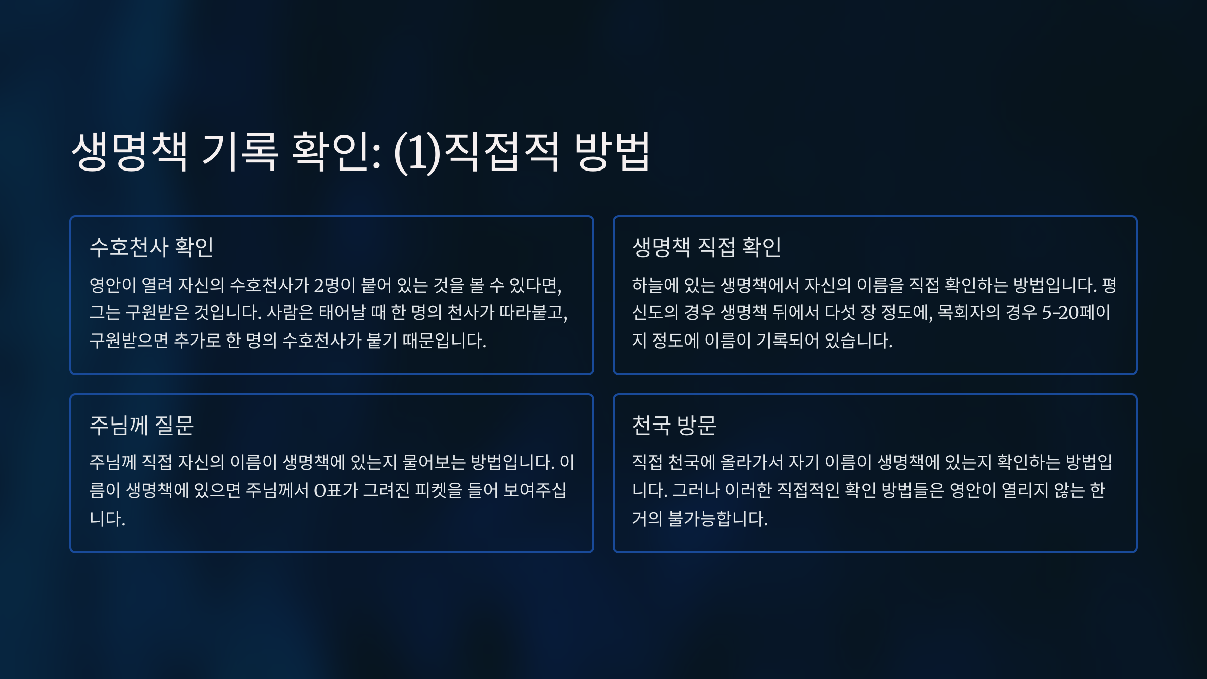 첫째, 직접적인 방법에는 다시 4가지가 있다. 그러나 이러한 확인 방법은 다 영안이 열려야 알 수 있는 것이다. 첫째로, 자신의 수호천사가 2명이 붙어 있으면 그는 구원을 받은 것이다. 왜냐하면 사람은 태어날 때부터 천사 한 명이 따라 붙는다. 이 천사는 사람의 일거수일투족을 기록하고 보고하는 천사이다. 그리고 그가 구원받아 생명책에 이름이 기록되면 그때 한 명의 수호천사가 달라붙는다. 그래서 그 사람에게 두 명이 천사가 붙어 있으면 그는 구원을 받은 것이다. 둘째로, 하늘에 있는 생명책에서 그 이름이 있는지를 확인해보는 것이다. 그때 보통 평신도의 경우는 생명책이 뒤에서 열리면서 맨 뒷장에서 다섯 장 정도에 걸쳐 그 이름이 기록된 채 있는 것을 볼 수 있다. 그리고 목회자의 경우에는 사람마다 다르겠지만 보통은 5페이지에서 20페이지 정도에 그 이름이 기록된 채 있는 것을 볼 수 있다. 그러나 생명책에 열려지지 않거나 열려졌다가 닫혀지면 그 이름이 생명책에 없는 것이다. 셋째로, 주님께 그 사람의 이름이 생명책에 있는지를 물어보는 것이다. 그러면 주님께서 그 사람의 이름이 생명책에 있으면 O표가 그려진 피컷을 들어 보여주신다. 넷째로, 직접 천국에 올라가서 자기 이름이 생명책에 있는지를 확인해보는 것이다. 그러나 이와같은 4가지 직접적인 확인방법은 영안이 열리지 않는한 거의 불가능하다. 이때에는 다른 것을 통하여 간접적으로 확인을 할 수 밖에 없다.