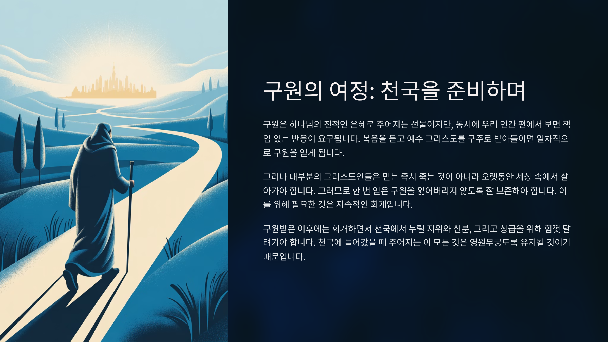 구원은 하나님의 전적인 은혜로 주어지는 선물이지만, 동시에 우리 인간 편에서 보면 책임 있는 반응이 요구된다. 어느날 내가 복음을 듣고 예수 그리스도의 십자가 공로를 깨닫고 자신이 죄인임이 시인한 후에 그분을 자신의 구주로 받아들인다면 그때 그는 생명주는 영으로부터 생명공급을 받게 된다. 그리하여 그는 일차적으로 구원얻은 자가 된다. 만약 그 시간에 그가 죽는다면 그는 틀림없이 천국에 들어갈 것이다. 하지만 대부분의 그리스도인들은 믿는 즉시 죽는 것이 아니라 오랫동안 세상 속에서 살아가야 한다. 그러므로 성도들은 한 번 얻은 구원을 잃어버리지 않도록 잘 보존해야 한다. 이를 위해 필요한 것은 회개하는 것이다. 자신이 지은 죄를 날마다 자백하는 것이다. 그러다 보면 어느날 내 속에 들어 있는 죄된 본성 곧 악한 영들이 내게서 떠나가게 될 것이다. 그러면 훨씬 더 죄를 덜 짓게 된다. 그러면 그때부터는 천국을 준비해야 한다. 천국에서 우리가 누릴 지위와 신분 그리고 상급은 지금 이 땅에 우리가 육체를 갖고 있을 때에만 준비할 수 있기 때문이다. 그러므로 구원받은 이후에는 회개하면서 천국에서 누릴 지위와 신분 그리고 상급을 위해 힘껏 달려가야 한다. 그리고 천국에서 들어갔을 때에 주어지는 지위와 신분과 상급은 영원무궁토록 계속해서 그대로 유지될 것이기 때문이다. 고로 구원의 길을 걷는 모든 이들에게 이 말씀이 밤의 등불과 같은 안내서가 됨으로, 천국에 들어가는 그날까지 앞으로 힘차게 전진하는데 많은 도움이 될 수 있기를 소망한다.