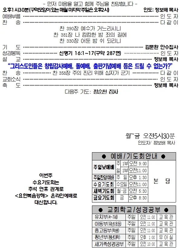2. 2025-09-28(주일) 교회소식 및 예배안내_성령강림후 열여섯째주일