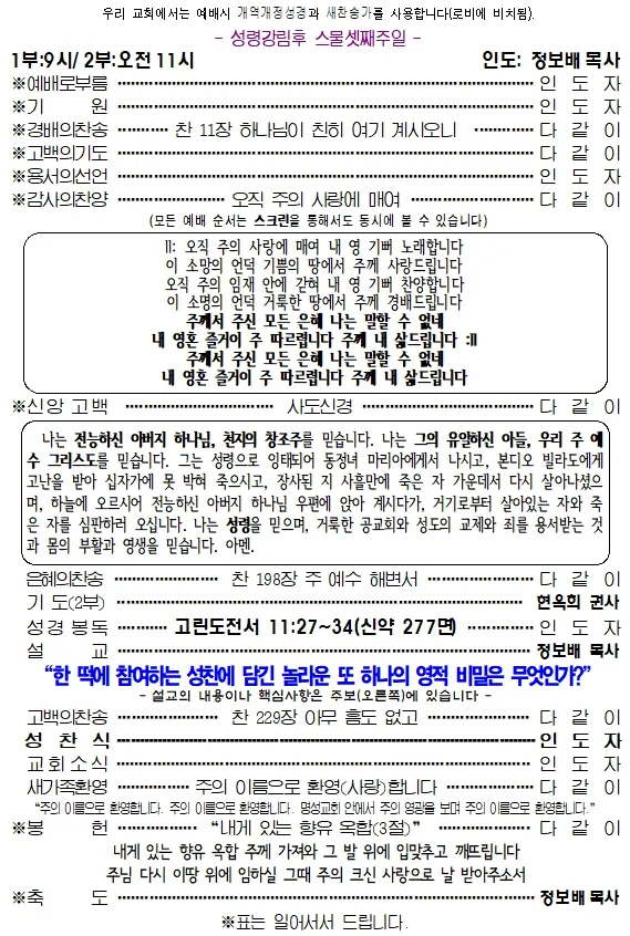 1. 새가족환영: 동탄명성교회는 대한예수교장로회(통합) 경기노회에 속해있는 교회입니다. 새로 오신 분들을 진심으로 환영합니다. 우리 교회는 WCC와 동성애와 종교다원주의를 지지하지 않습니다. 저희 교회에서 신앙생활을 하시기를 원하시는 분은 예배후 잠깐 남으셔서 담임목사님과 만남을 갖고 가시기 바랍니다.