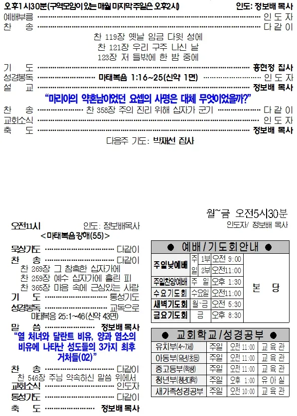 매주 교회소식과 함께 예배 일정을 안내드립니다.