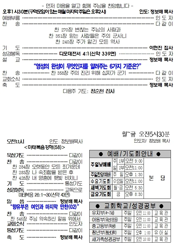 2026년 01월 112일(주일) 교회소식 및 예배안내입니다.