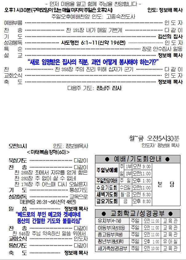 매주 교회소식과 함께 예배 일정을 안내드립니다.