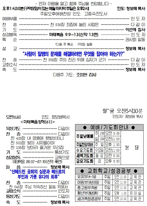 매주 교회소식과 함께 예배 일정을 안내드립니다.